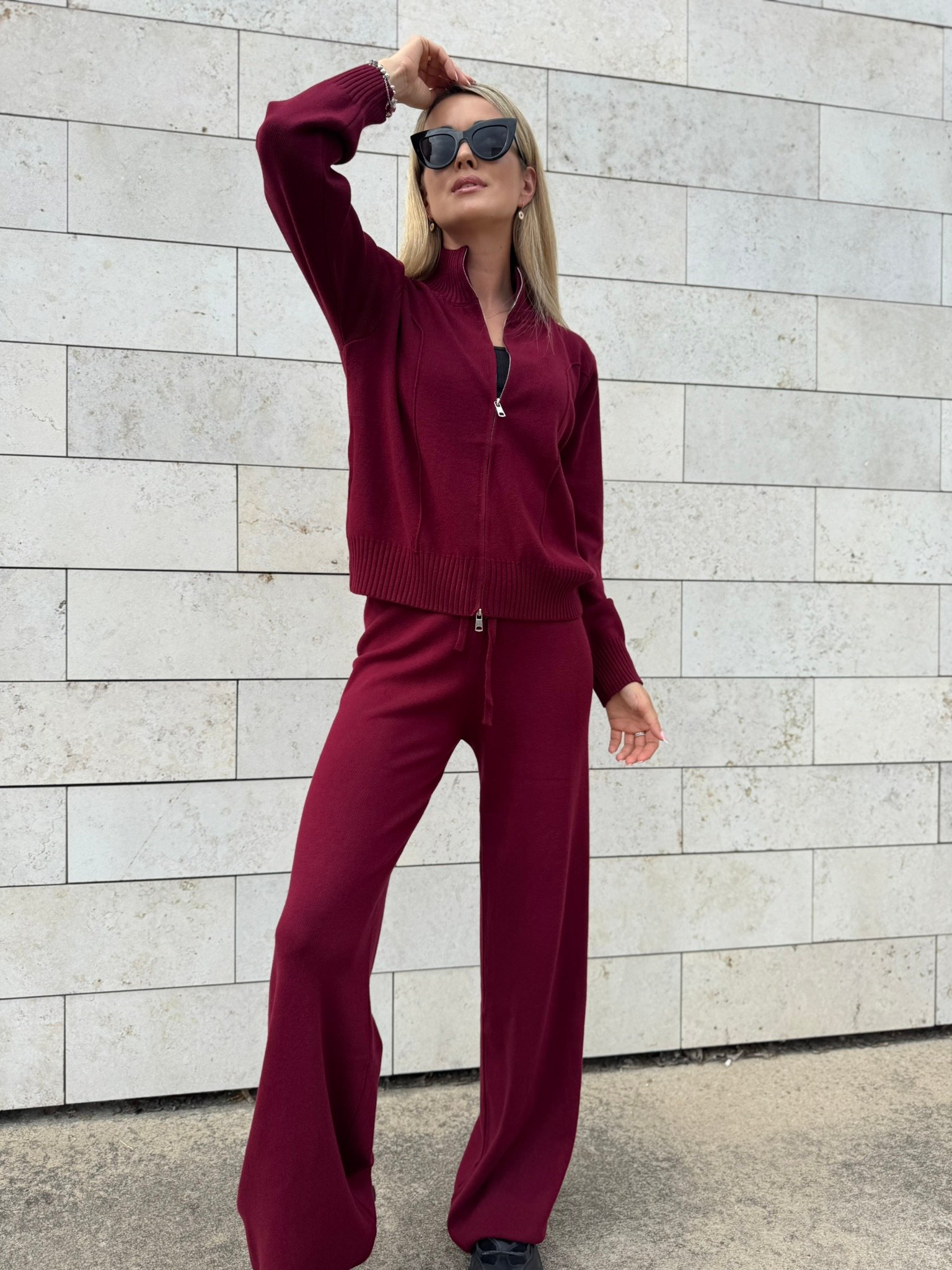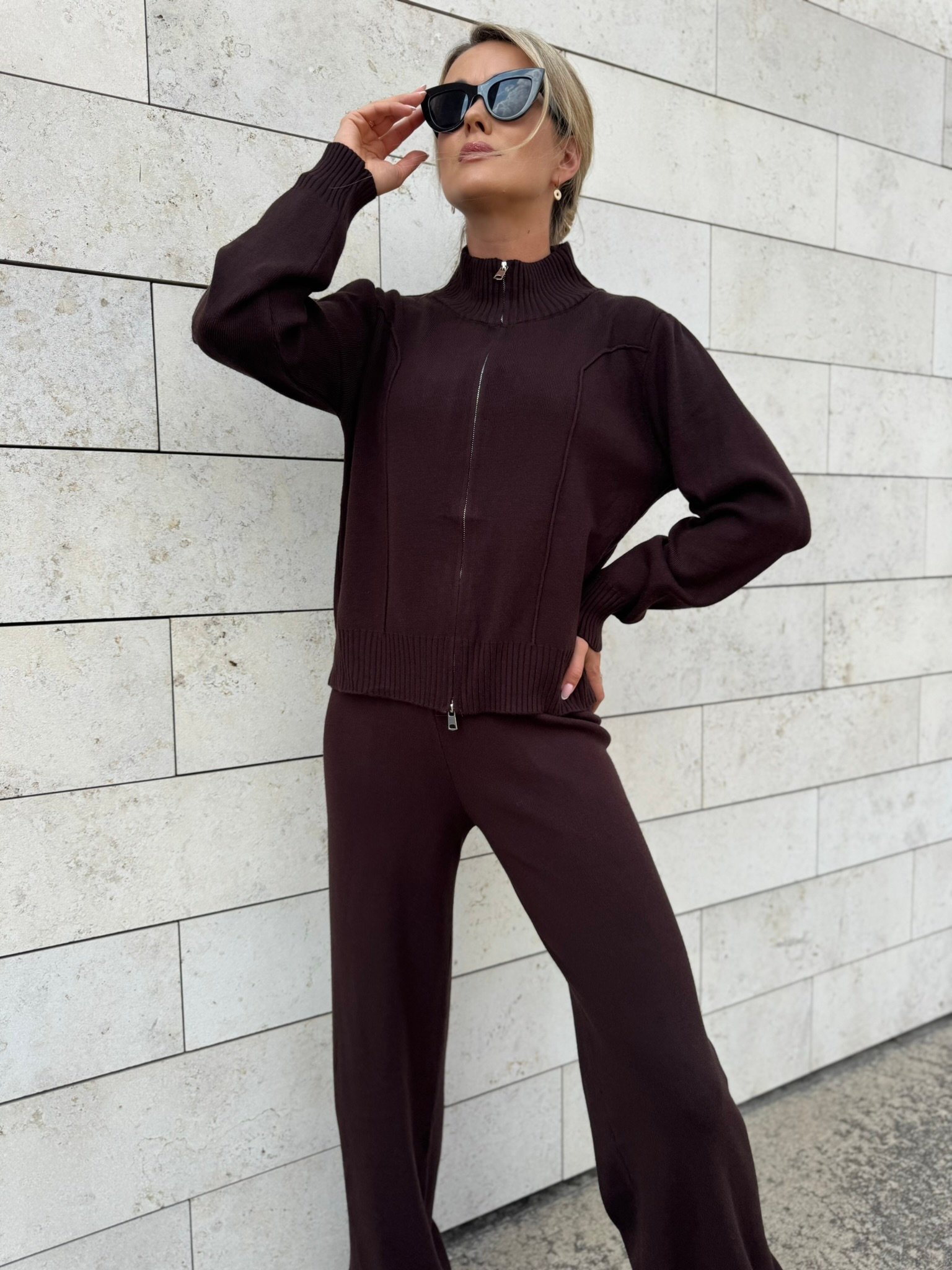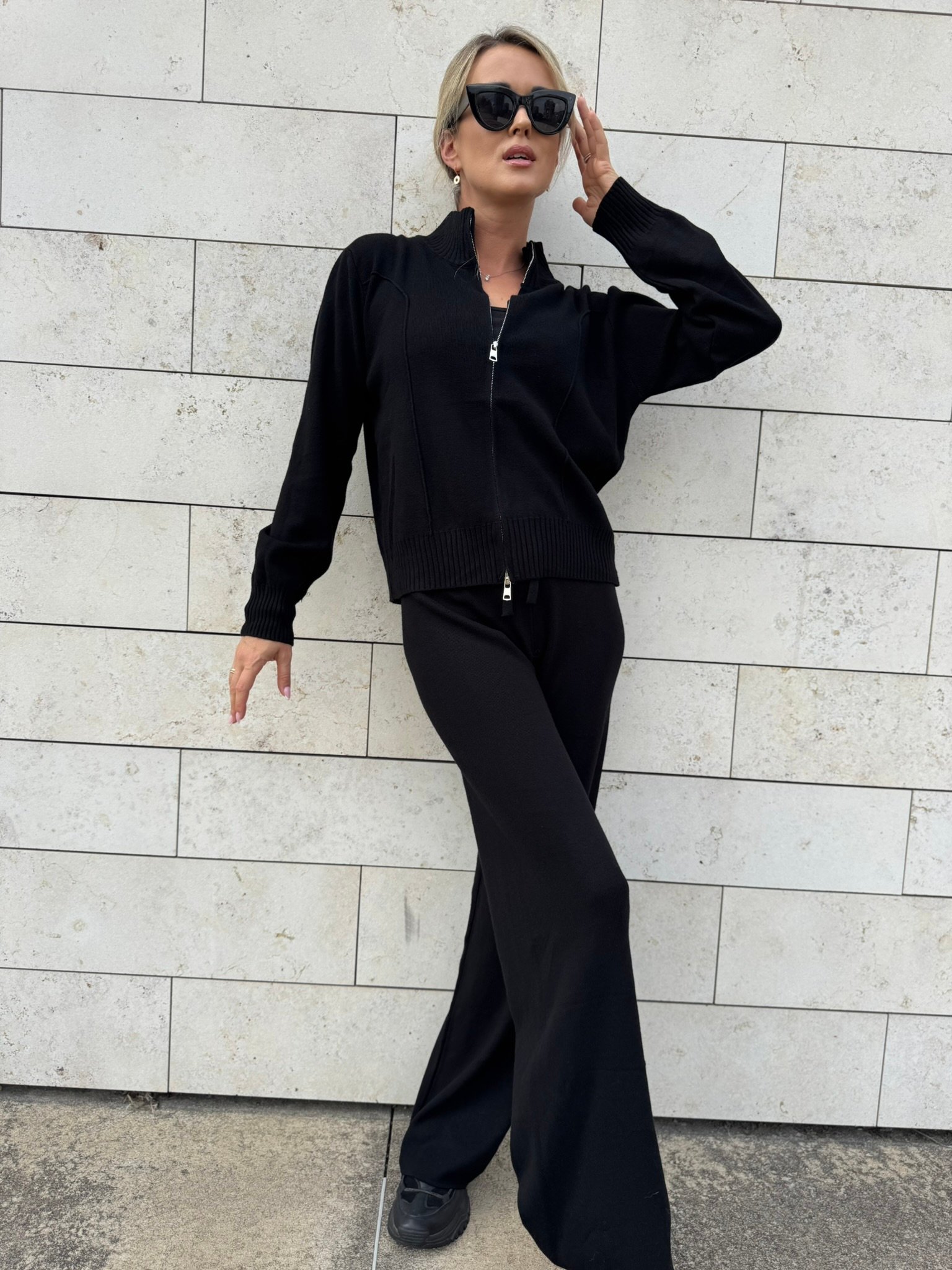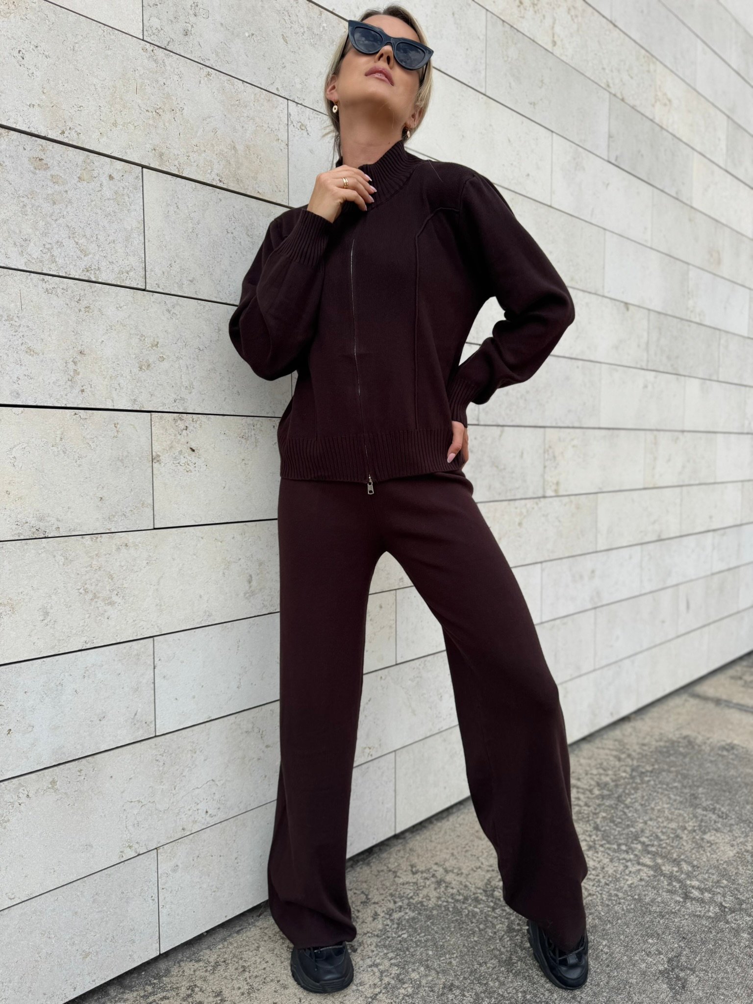 Laisvai krintančios kelnės pailgina kojas ir suteikia siluetui lengvumo, o užsegamas megztinis su aukšta apykakle – praktiškas ir šiuolaikiškas sprendimas vėsesniam orui. Komplektą lengvai derinsi su sportbačiais, aulinukais ar net klasikiniu paltu.