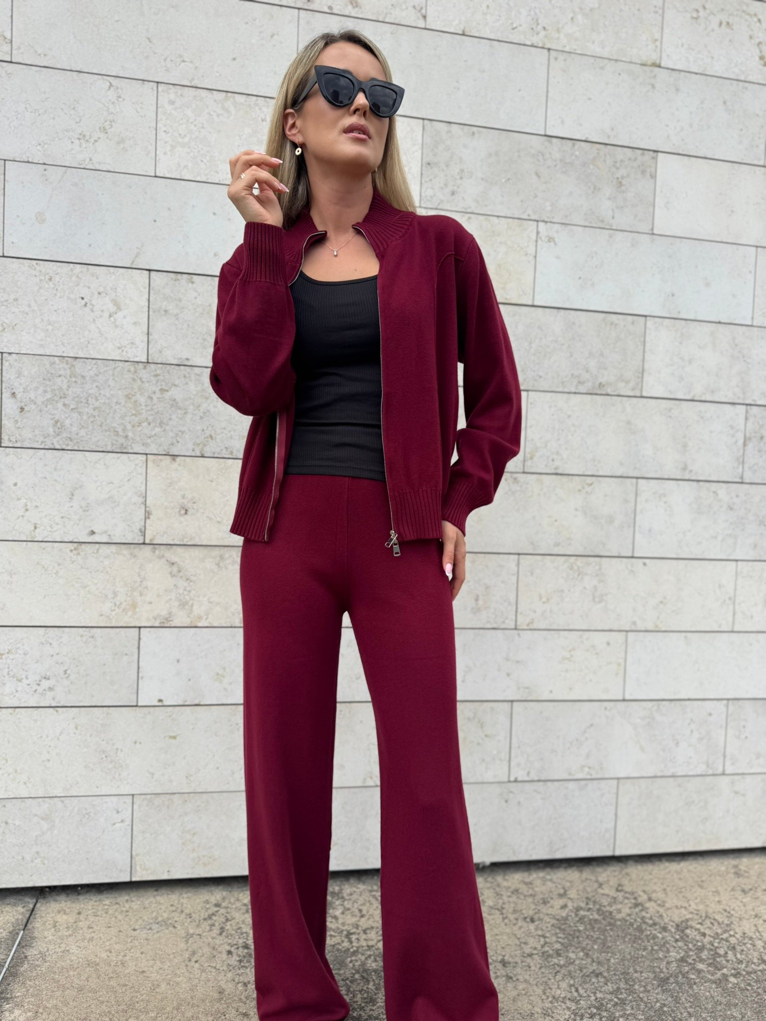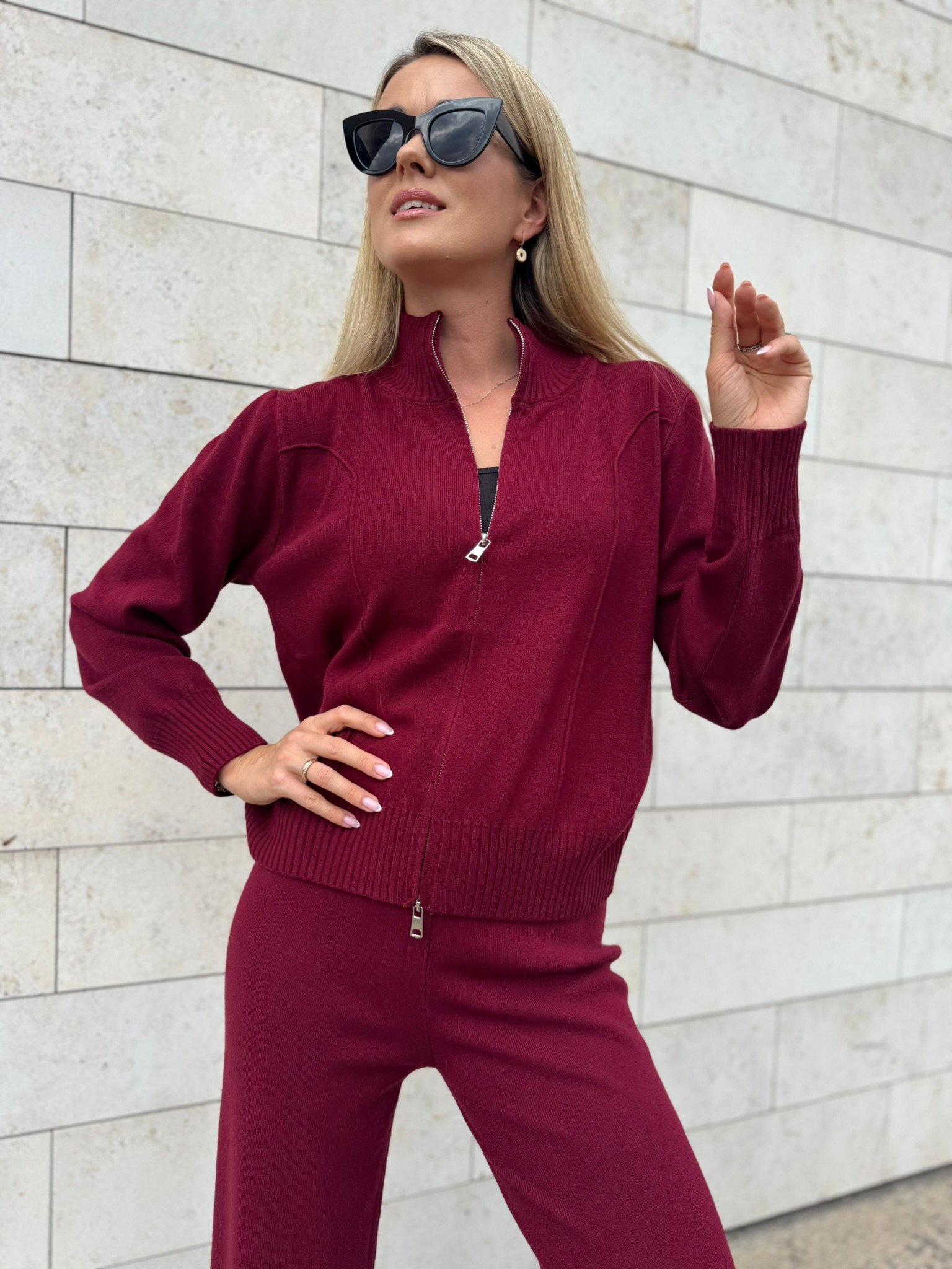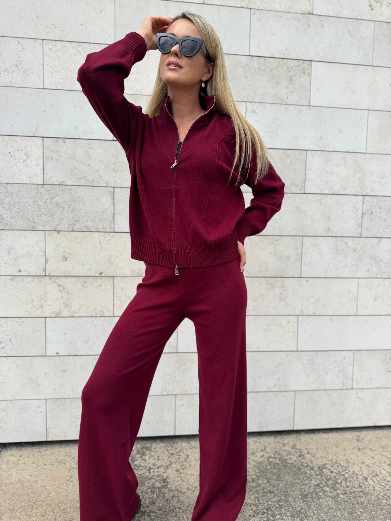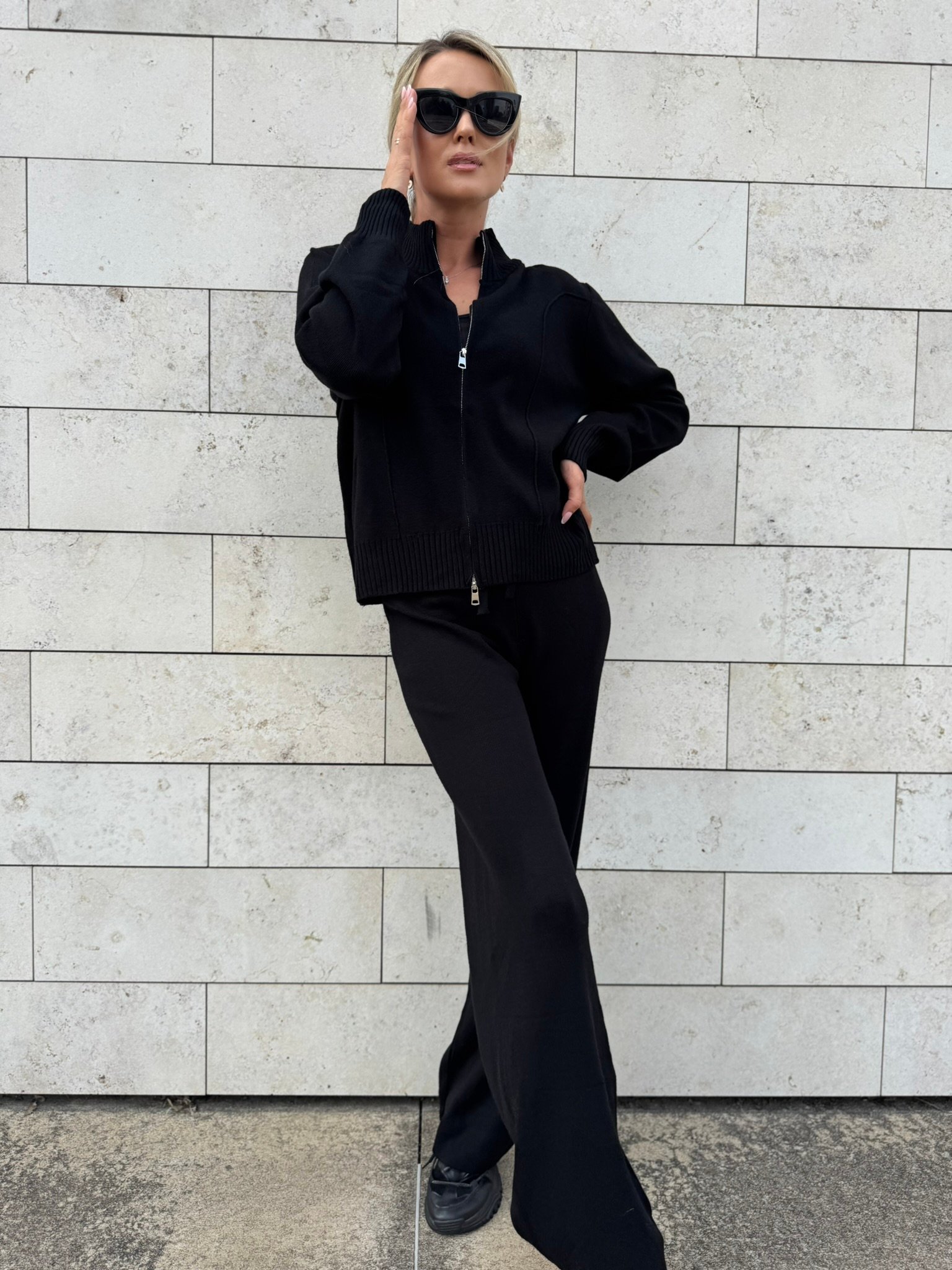 Laisvai krintančios kelnės pailgina kojas ir suteikia siluetui lengvumo, o užsegamas megztinis su aukšta apykakle – praktiškas ir šiuolaikiškas sprendimas vėsesniam orui. Komplektą lengvai derinsi su sportbačiais, aulinukais ar net klasikiniu paltu.
