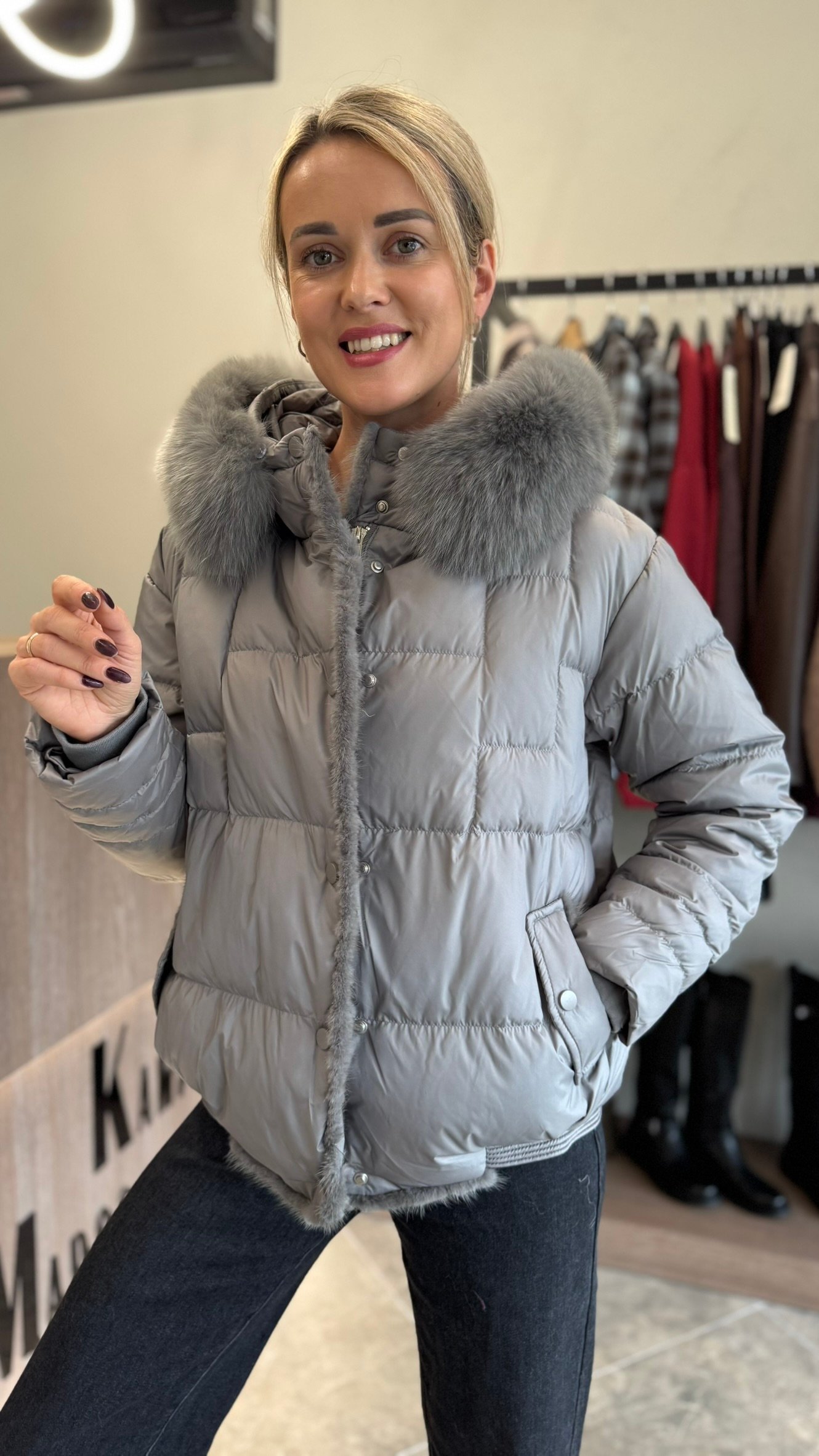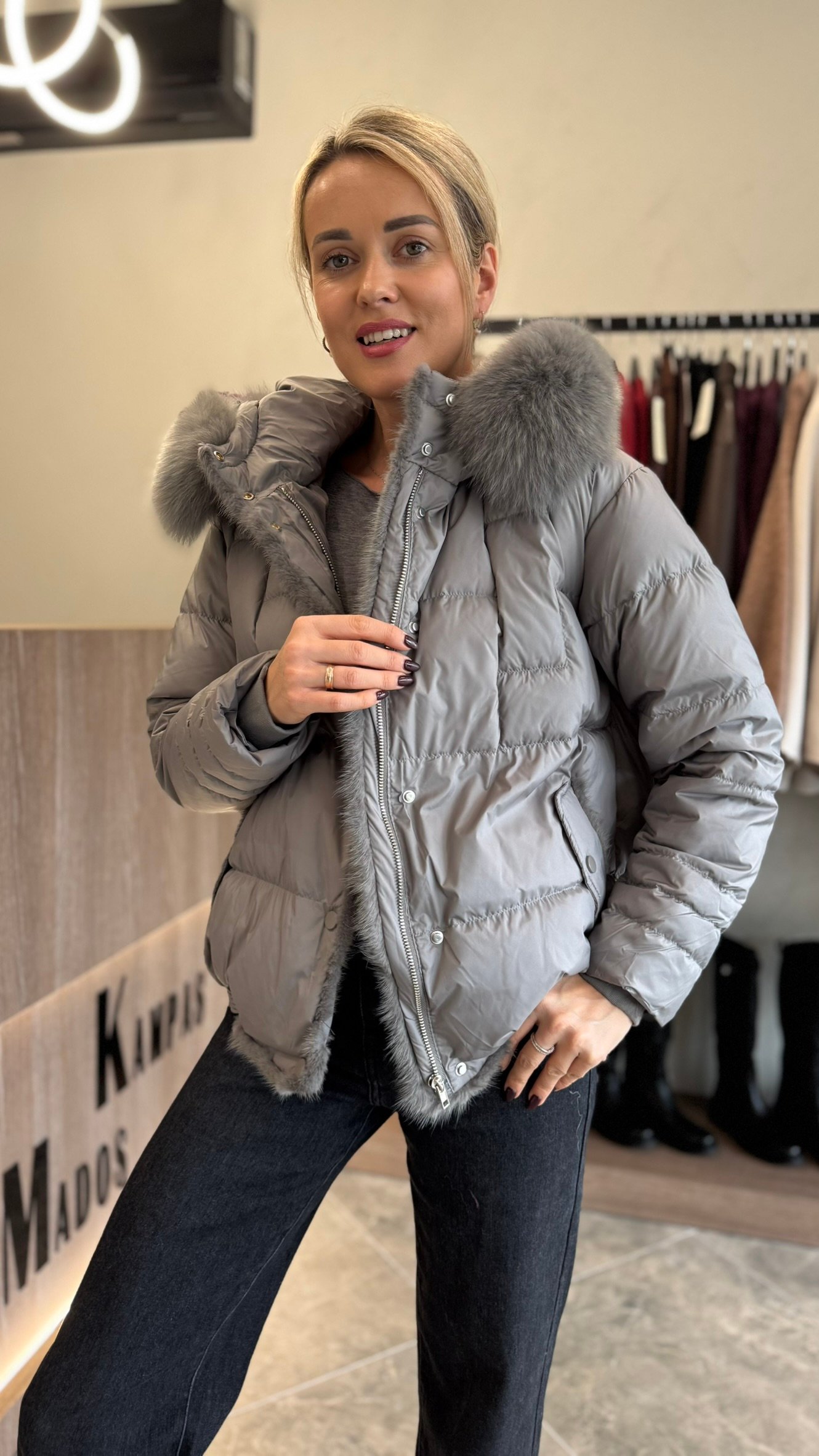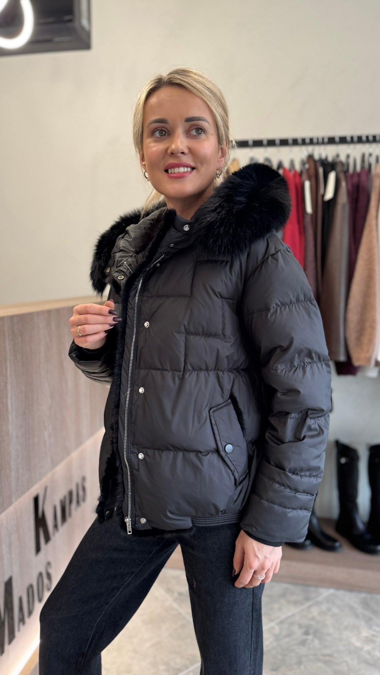 Pagaminta iš 100 % natūralaus anties pūko, ji puikiai išlaiko šilumą net šalčiausiomis dienomis, o puri kailinė apykaklė suteikia subtilios prabangos pojūtį.