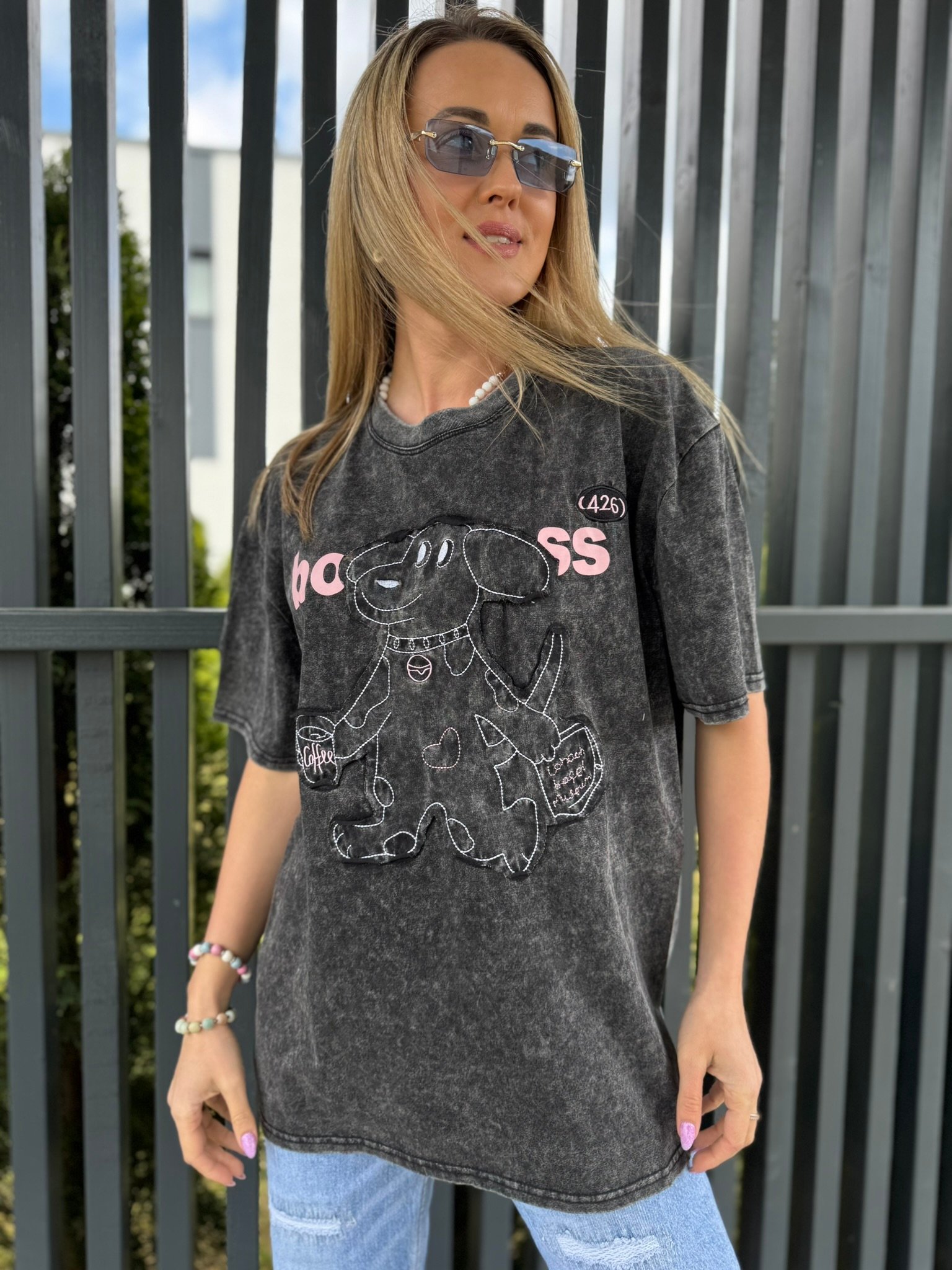 Linksmas oversize marškinėlių modelis su „rytiniu“ personažu – šuniuku su kavos puodeliu rankose.