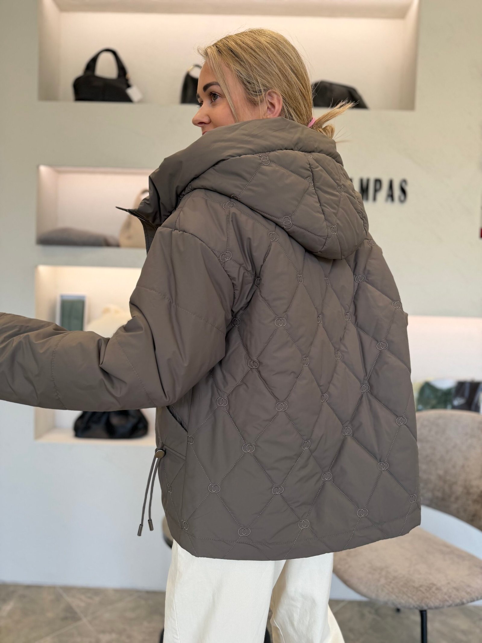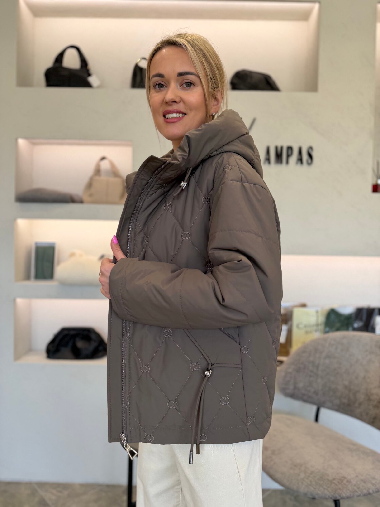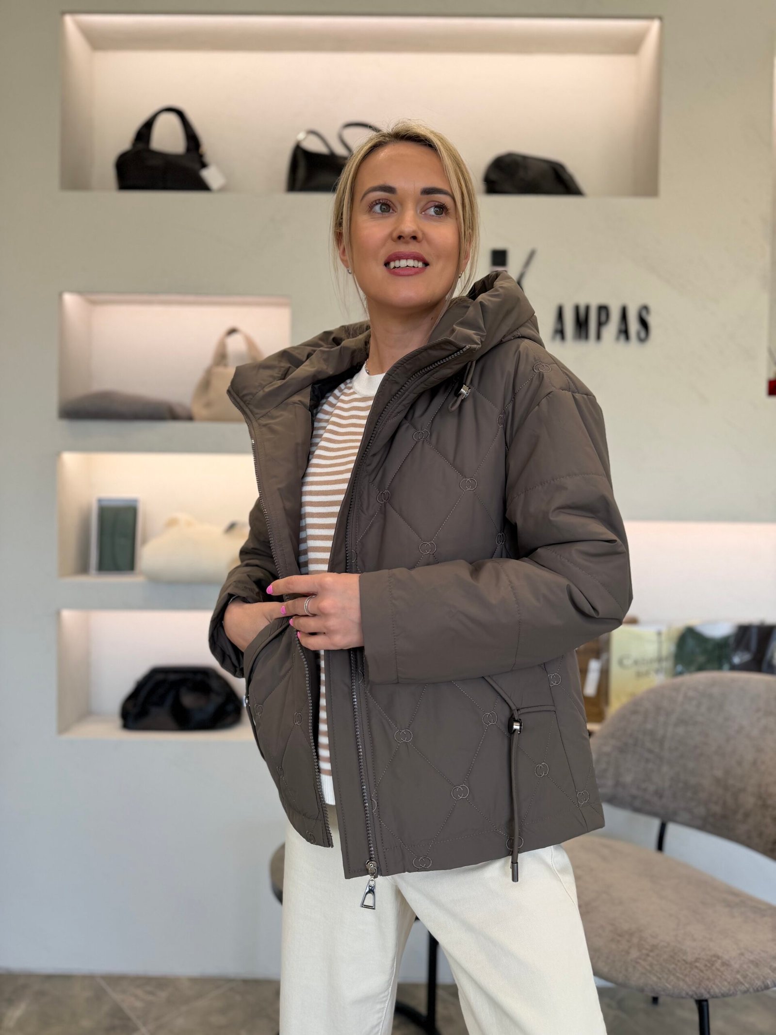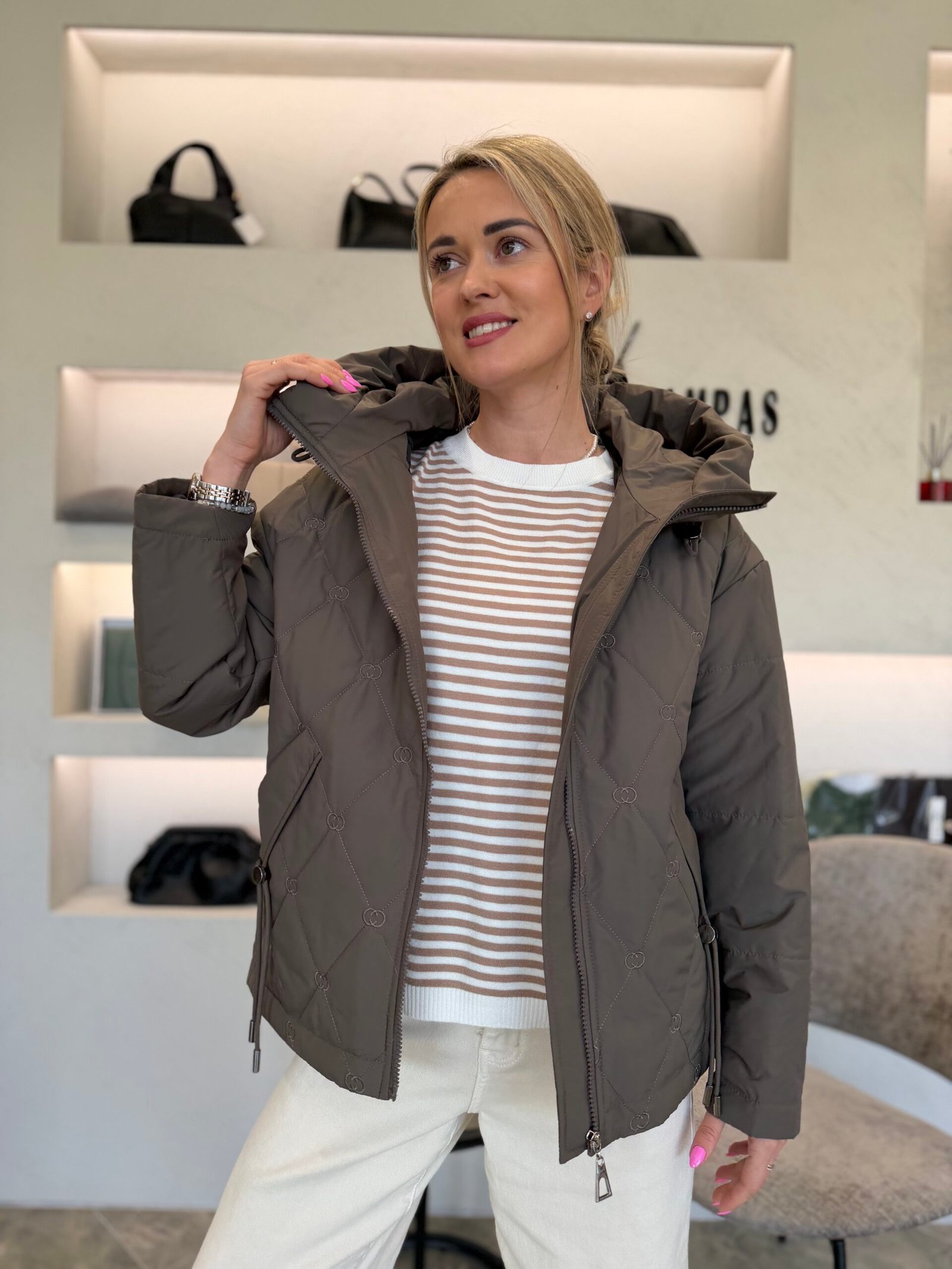 Subtilus dygsniuotas raštas suteikia išskirtinumo, o minkšta, šiek tiek pūstesnė forma – jaukumo pojūtį. Aukštesnė apykaklė saugo nuo vėjo, o reguliuojama apačia leidžia prisitaikyti siluetą pagal nuotaiką – nuo laisvesnio iki labiau formą pabrėžiančio.
