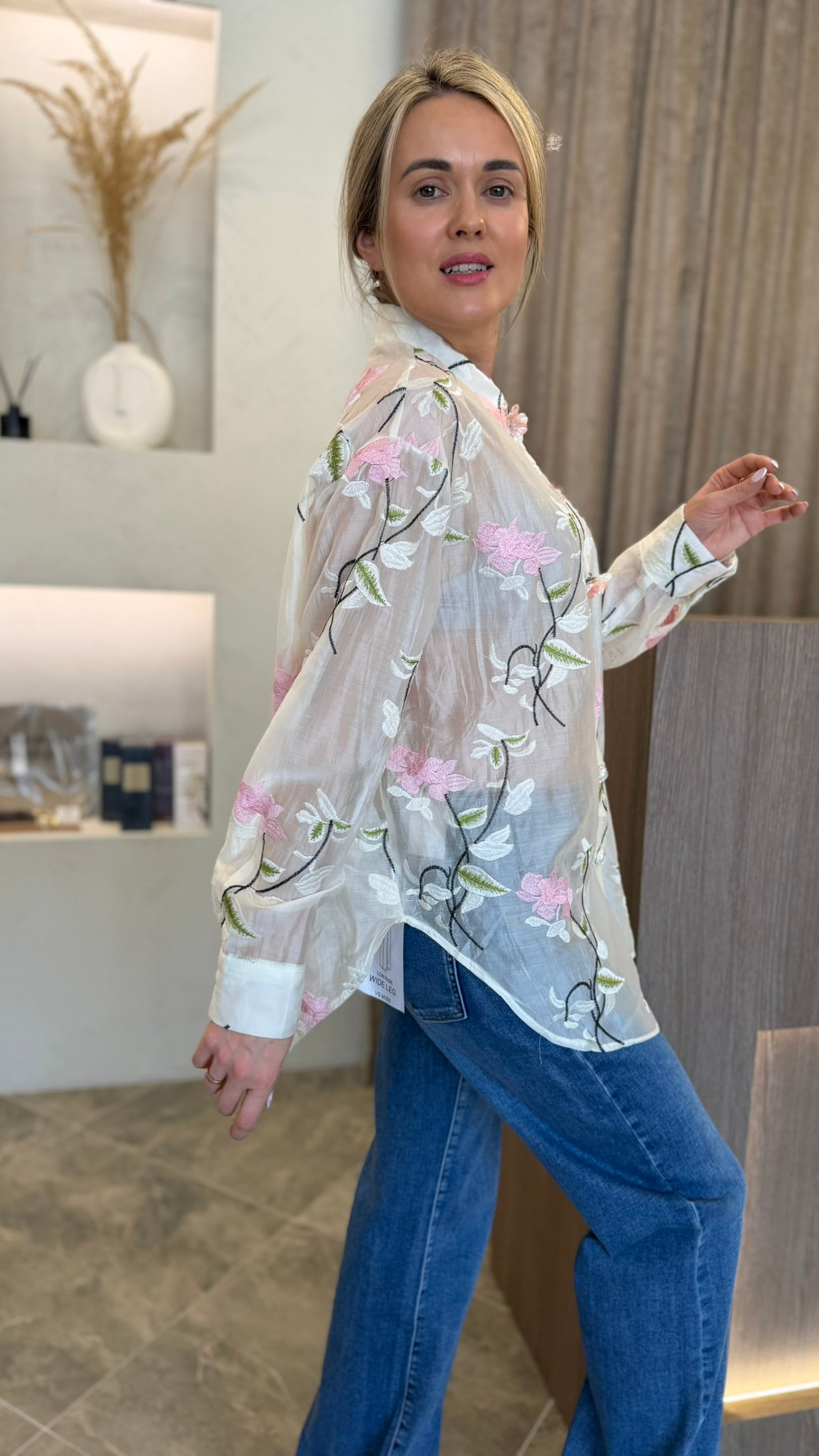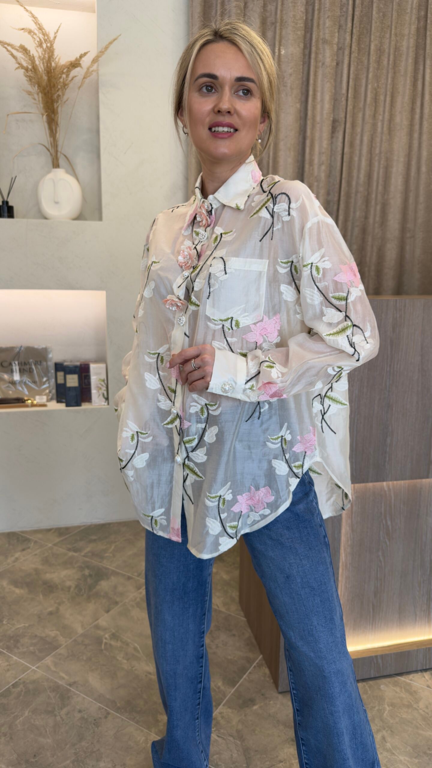 Lengvi, elegantiški marškiniai su subtiliu gėlių siuvinėjimu, kurie suteikia įvaizdžiui išskirtinumo ir moteriško švelnumo. Permatomas, lengvai krentantis audinys kuria gaivų siluetą, o klasikinė apykaklė ir sagutės leidžia marškinius lengvai pritaikyti tiek kasdieniams, tiek elegantiškesniems deriniams.