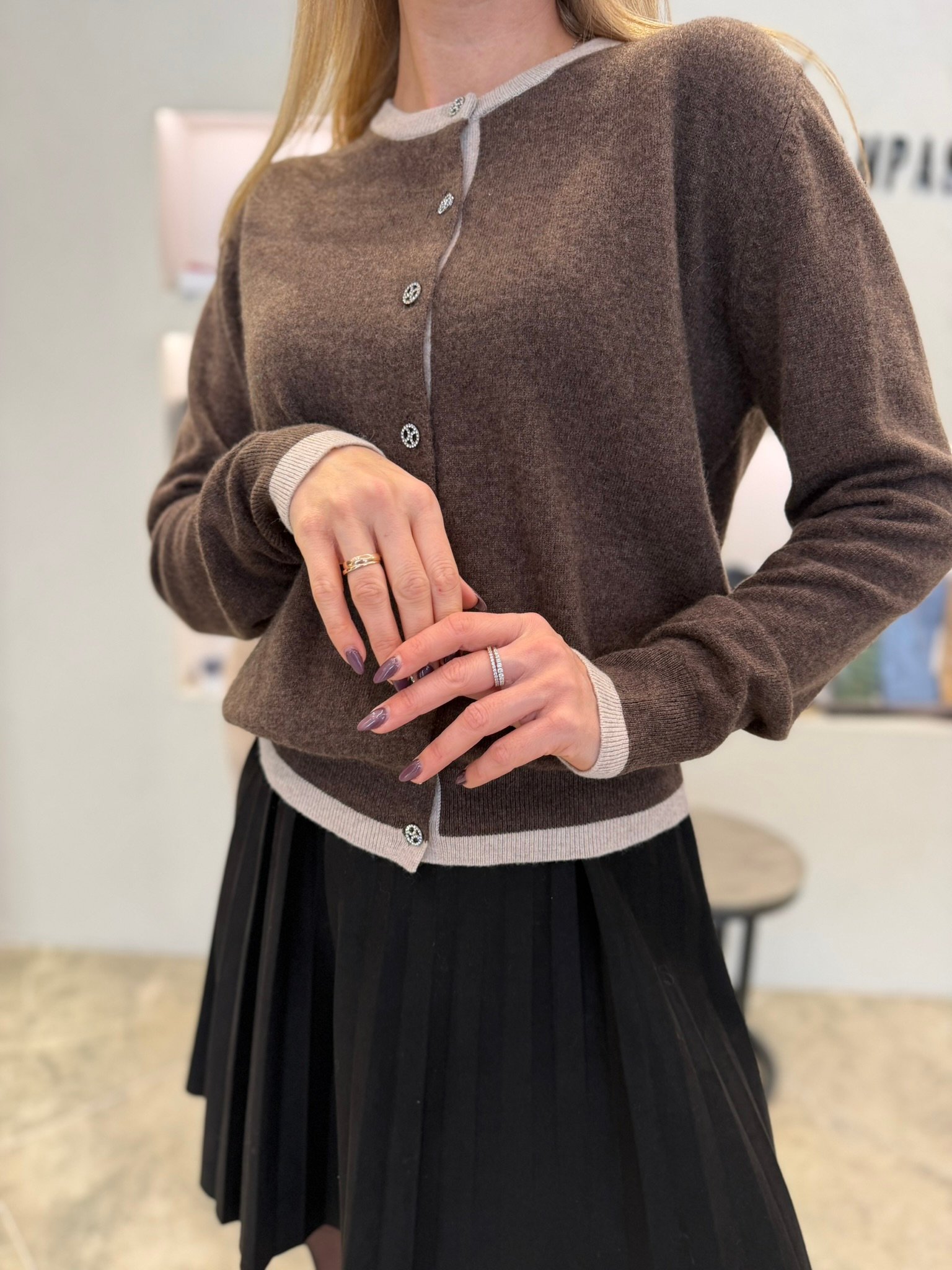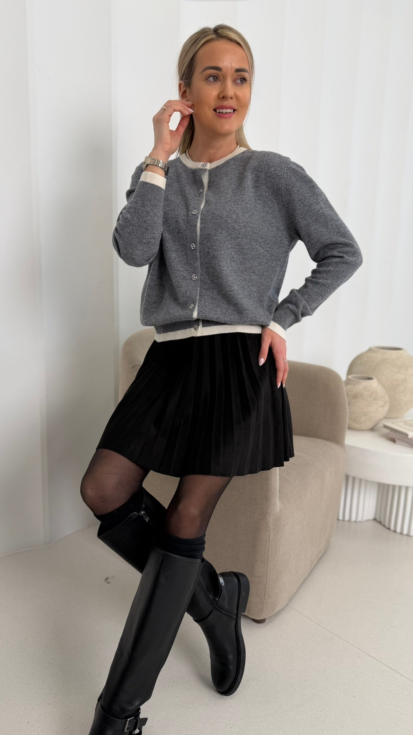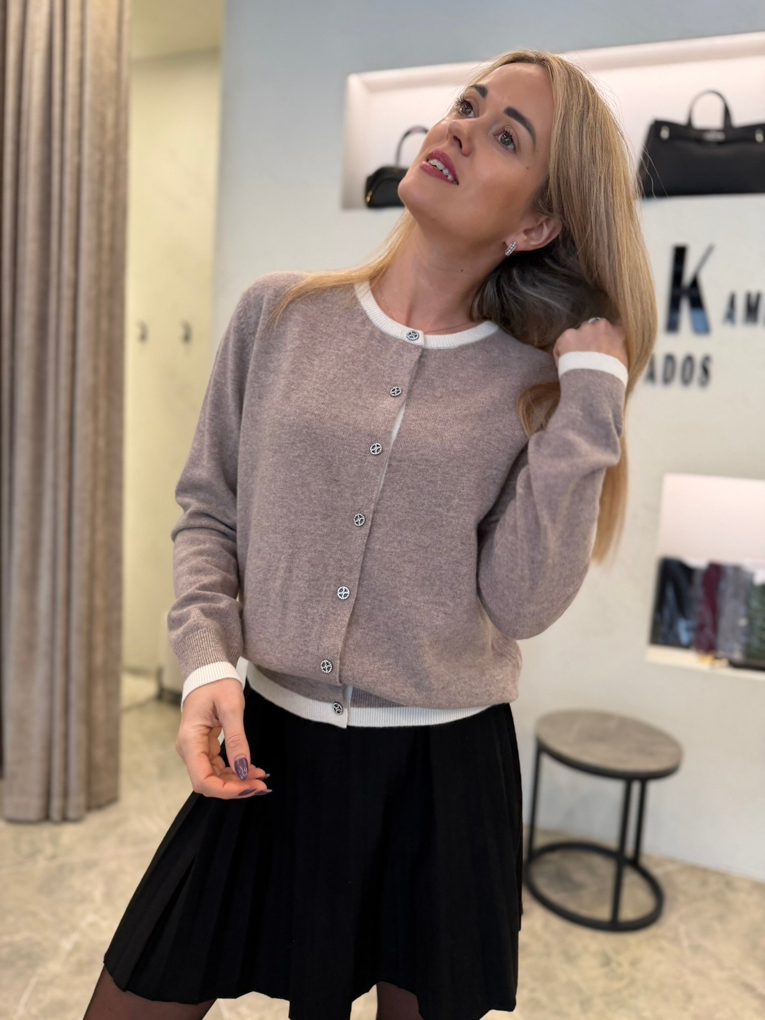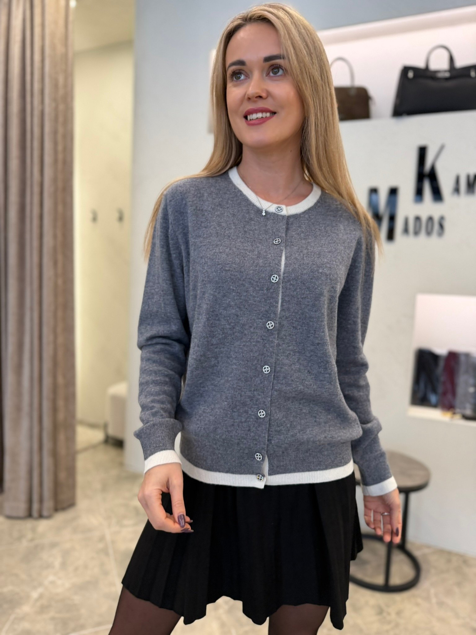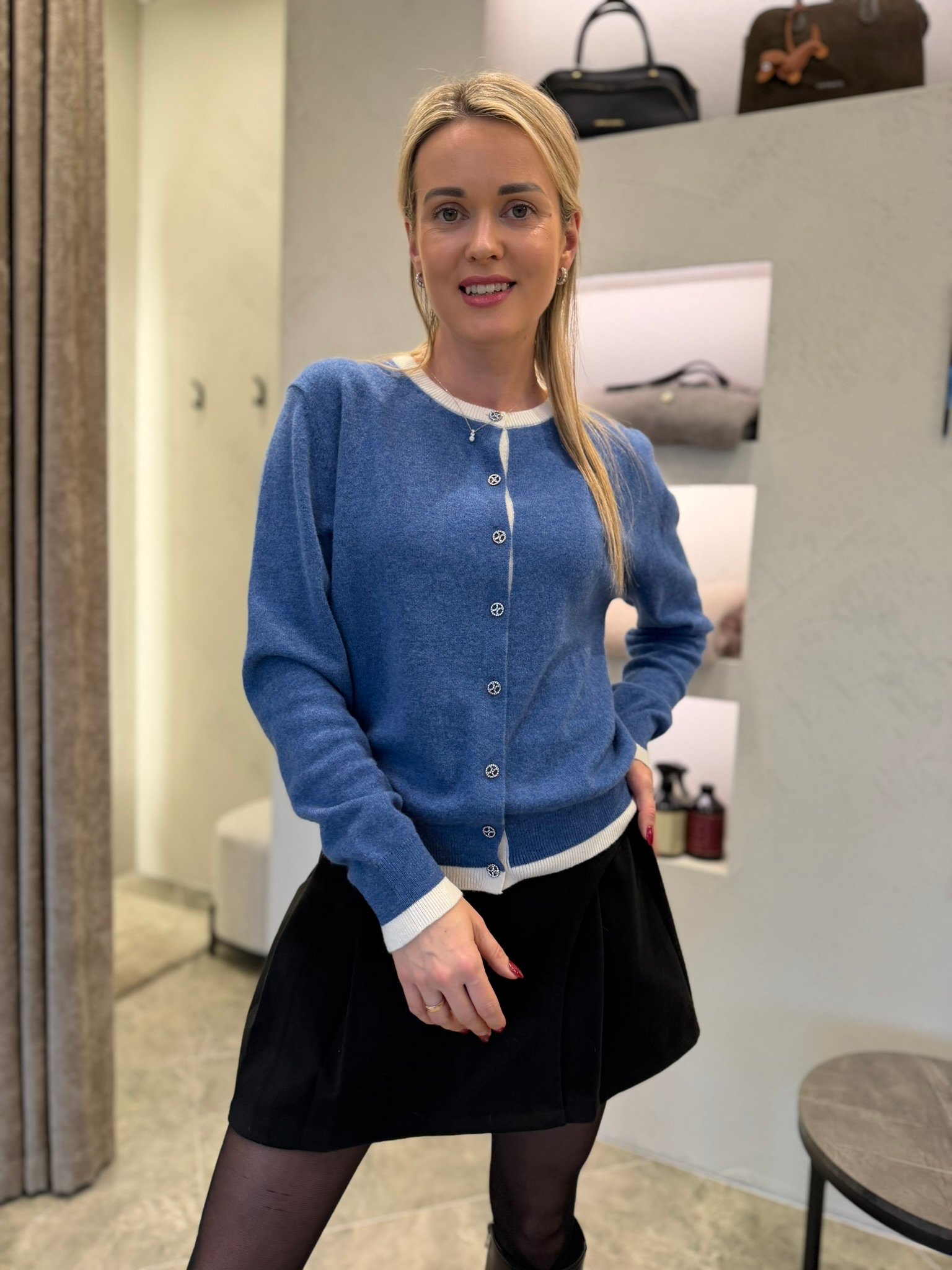 Klasikinė silueto linija ir sagų eilė priekyje leidžia megztuką dėvėti dviem būdais: kaip jaukų viršutinį sluoksnį arba kaip savarankišką minimalistinį topą. Derink prie sijono, kelnių ar džinsų – jis harmonizuojasi su viskuo ir tinka tiek darbui, tiek laisvalaikiui.