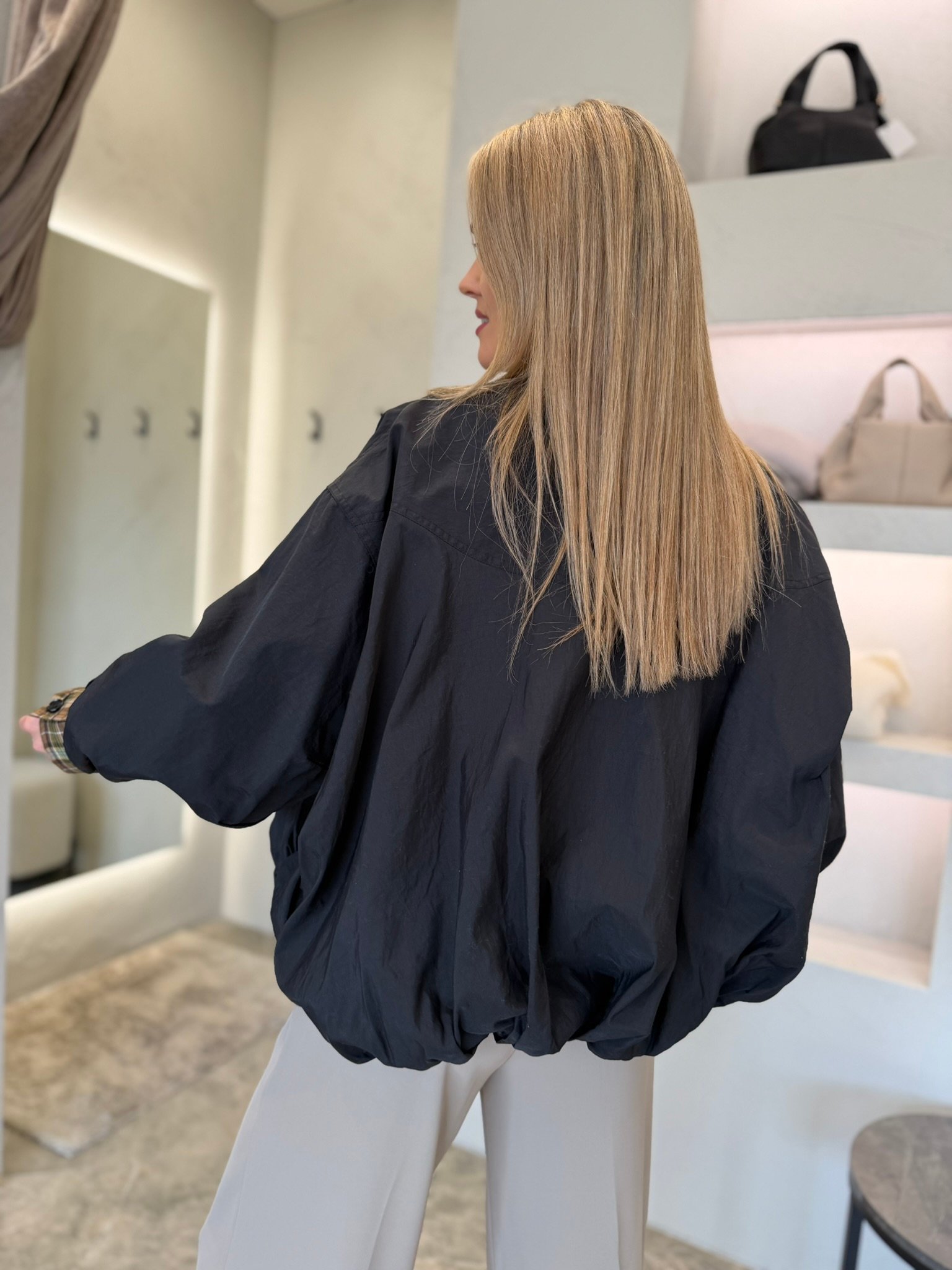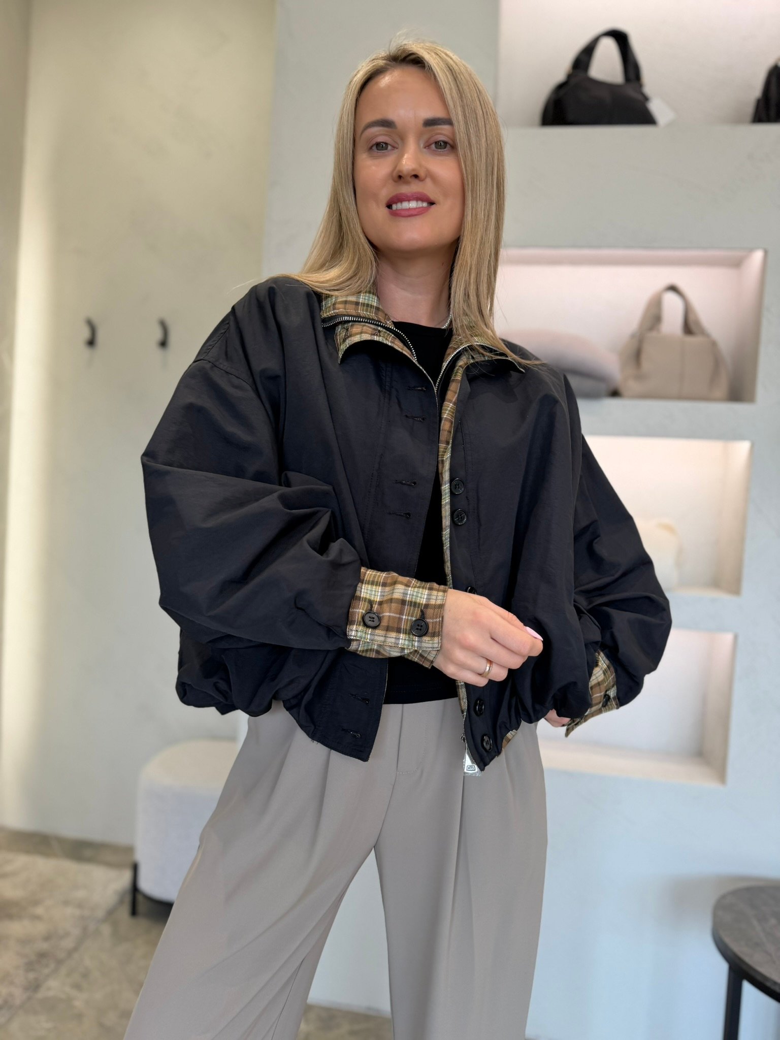 Laisvesnio, šiek tiek oversize silueto modelis gražiai krenta ir suteikia madingą „effortless“ įvaizdį. Pūstos rankovės ir lengvai susitraukiantis apačios siluetas kuria išskirtinę formą, o kontrastinis languotas pamušalas rankogaliuose ir apykaklėje suteikia subtilaus išskirtinumo.