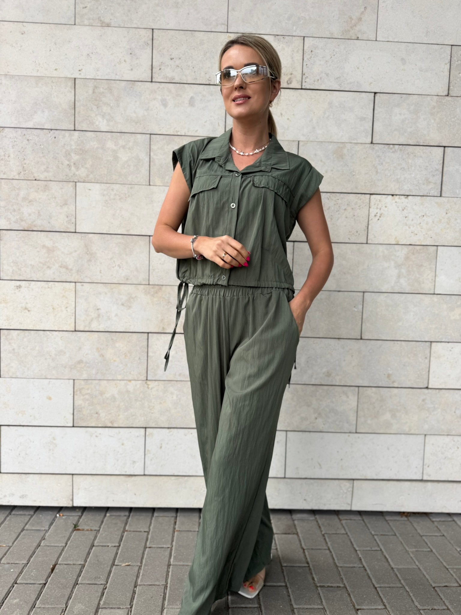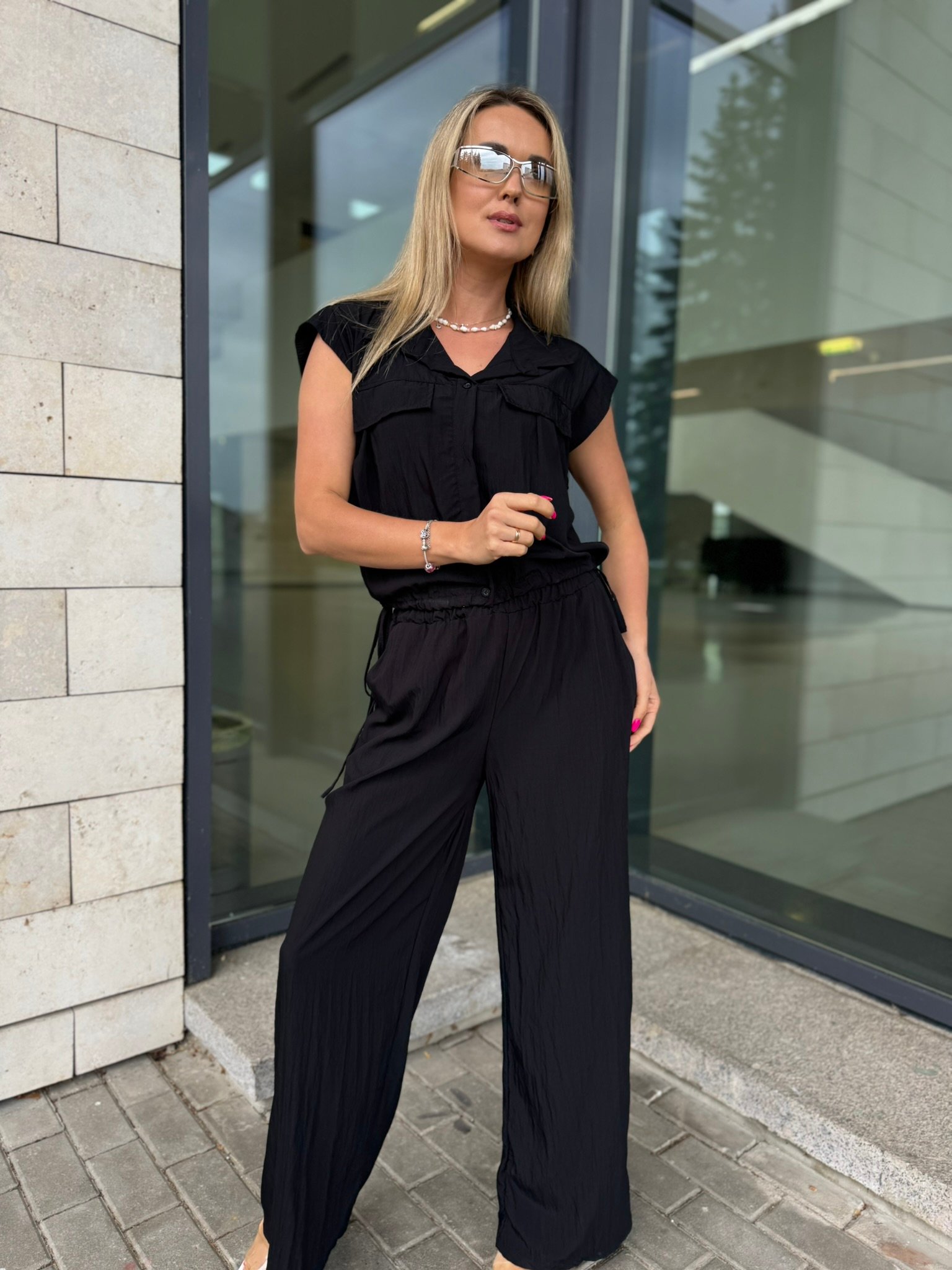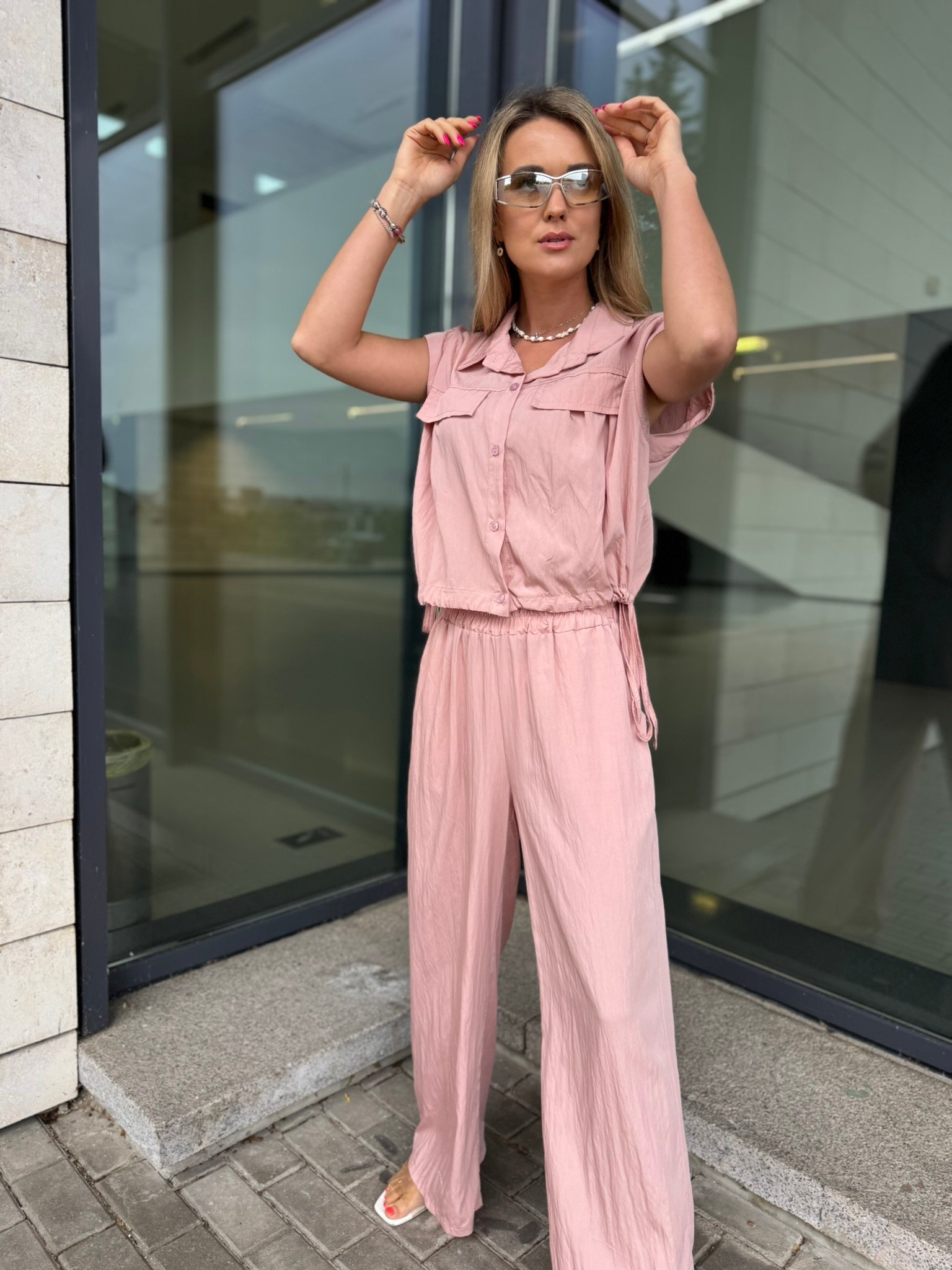 Laisvė, kuri juda kartu su Tavimi. Šis lengvas, krintantis „Easy Elegance“ dviejų dalių komplektas – tai miesto vasaros klasika. Oversize tipo viršus su kišenėlėmis suteikia šiuolaikiško stiliaus pojūtį, o plačios kelnės nevaržo judesių ir leidžia jaustis patogiai visą dieną.