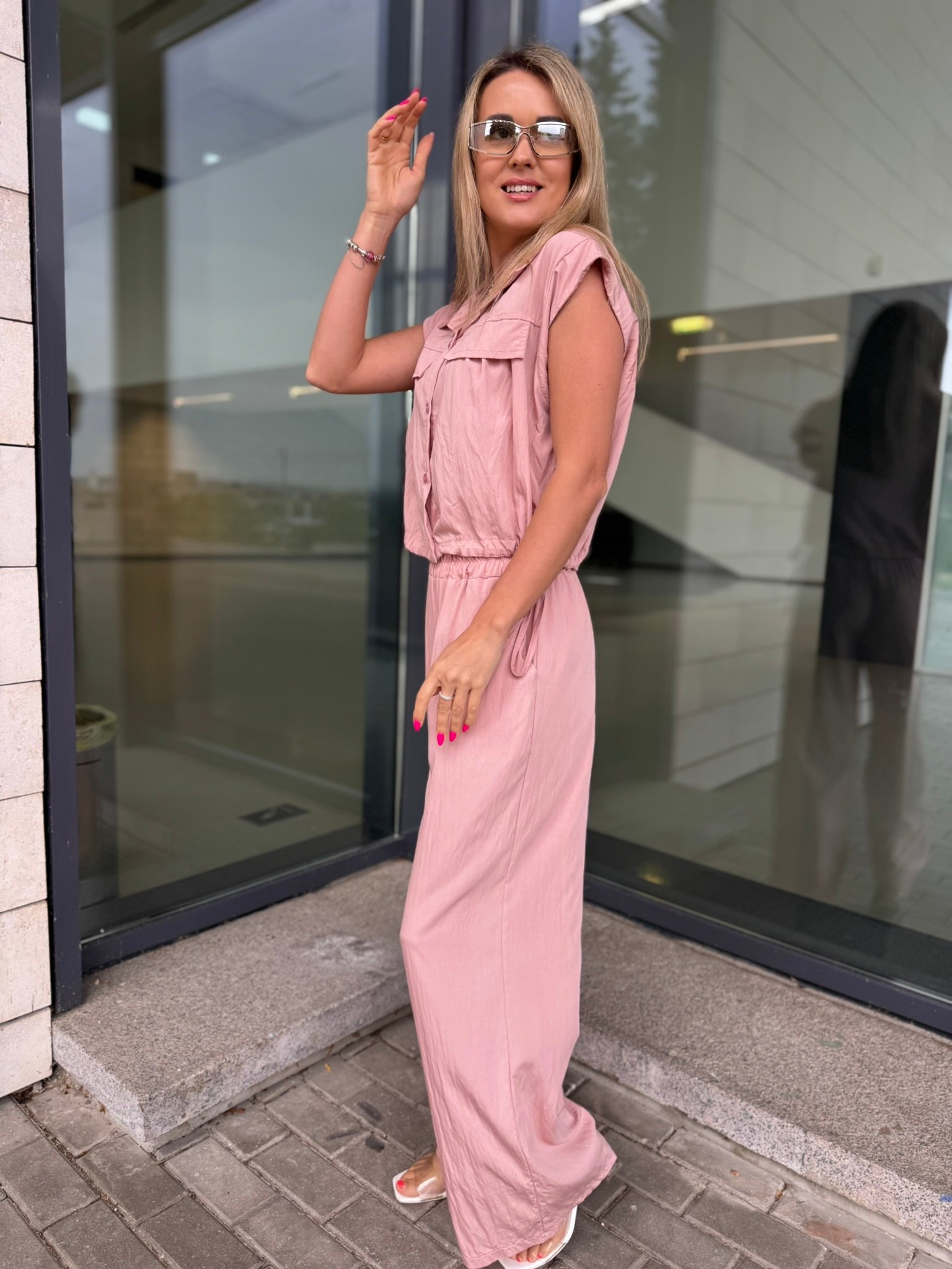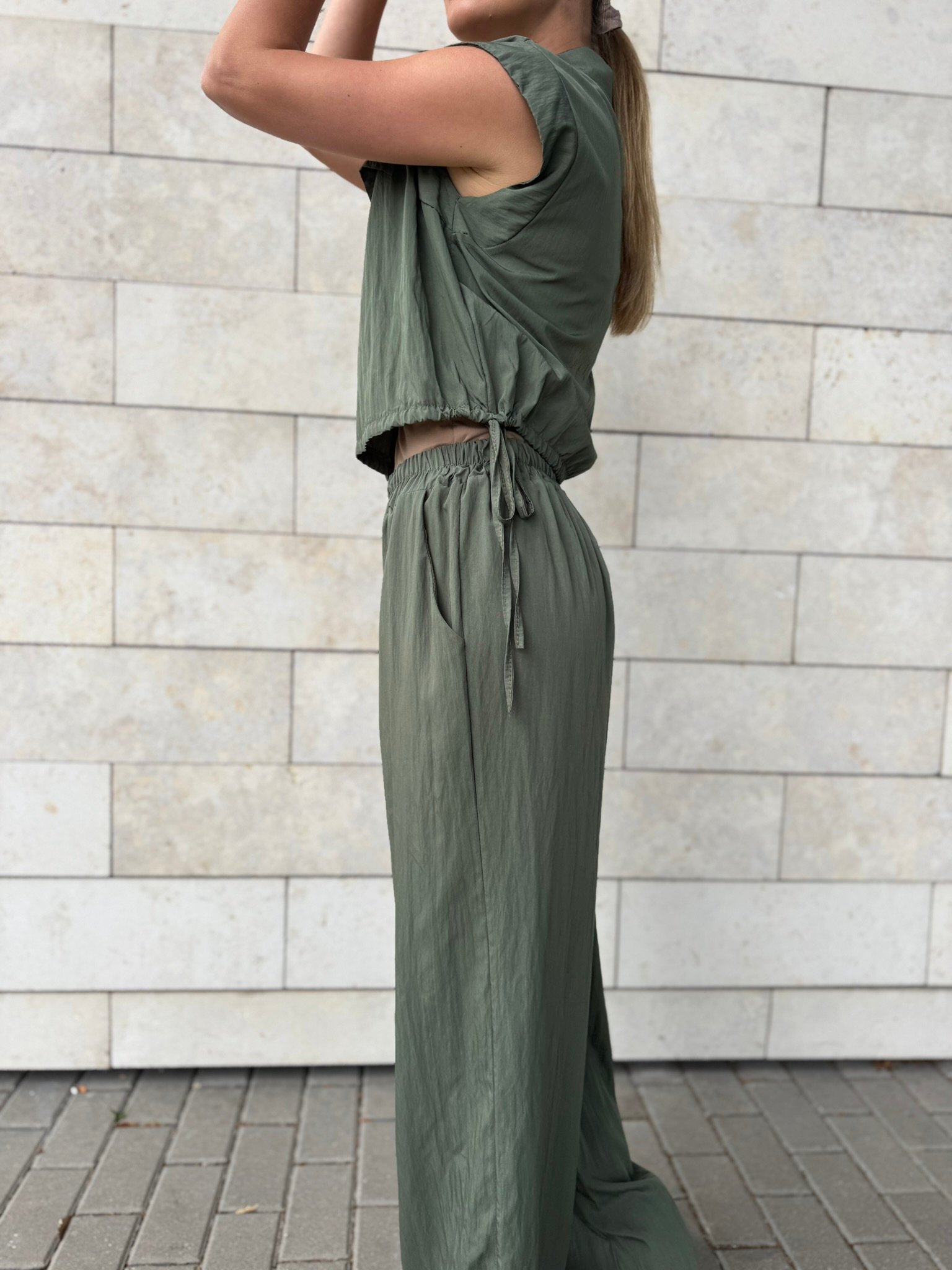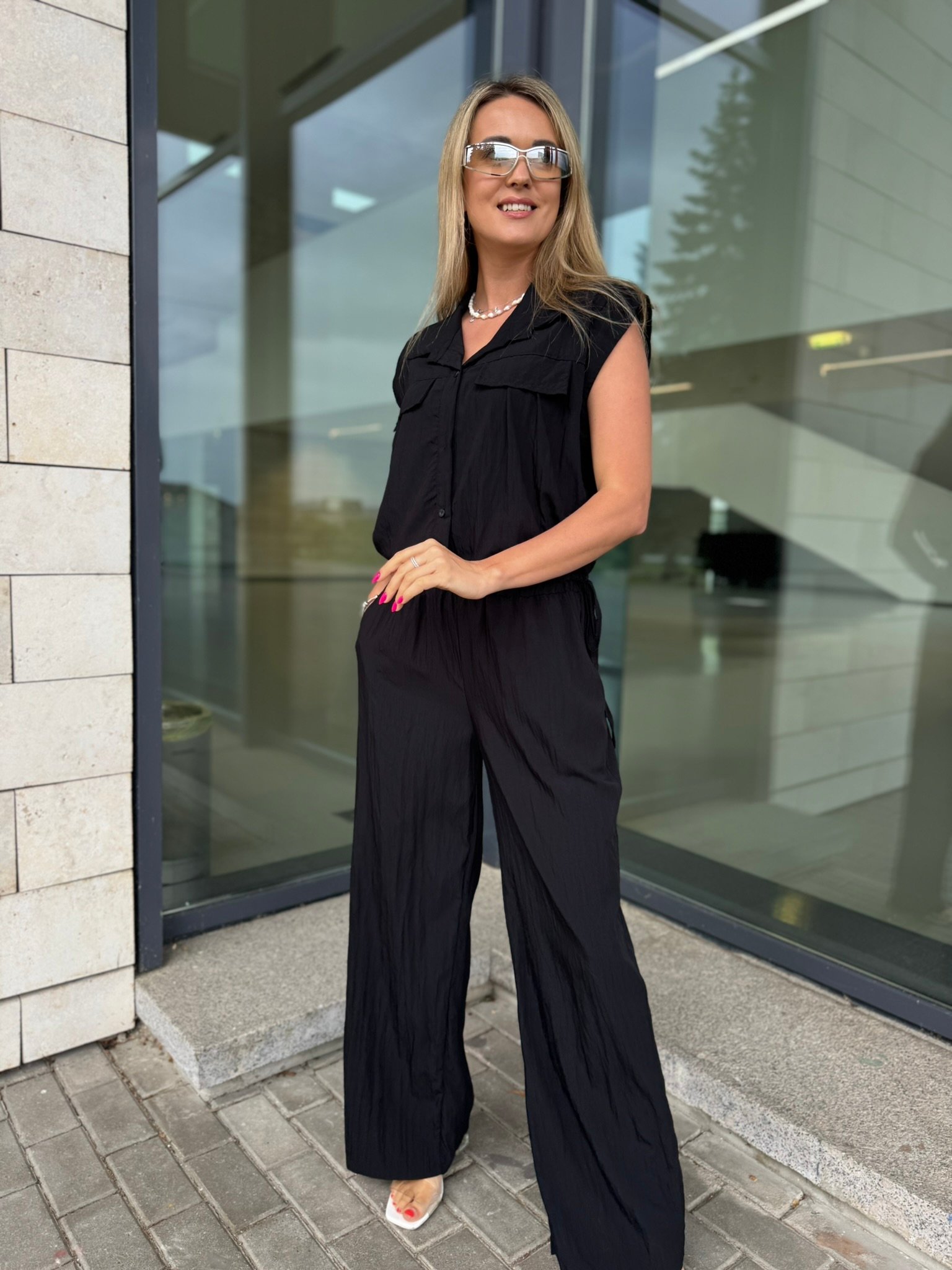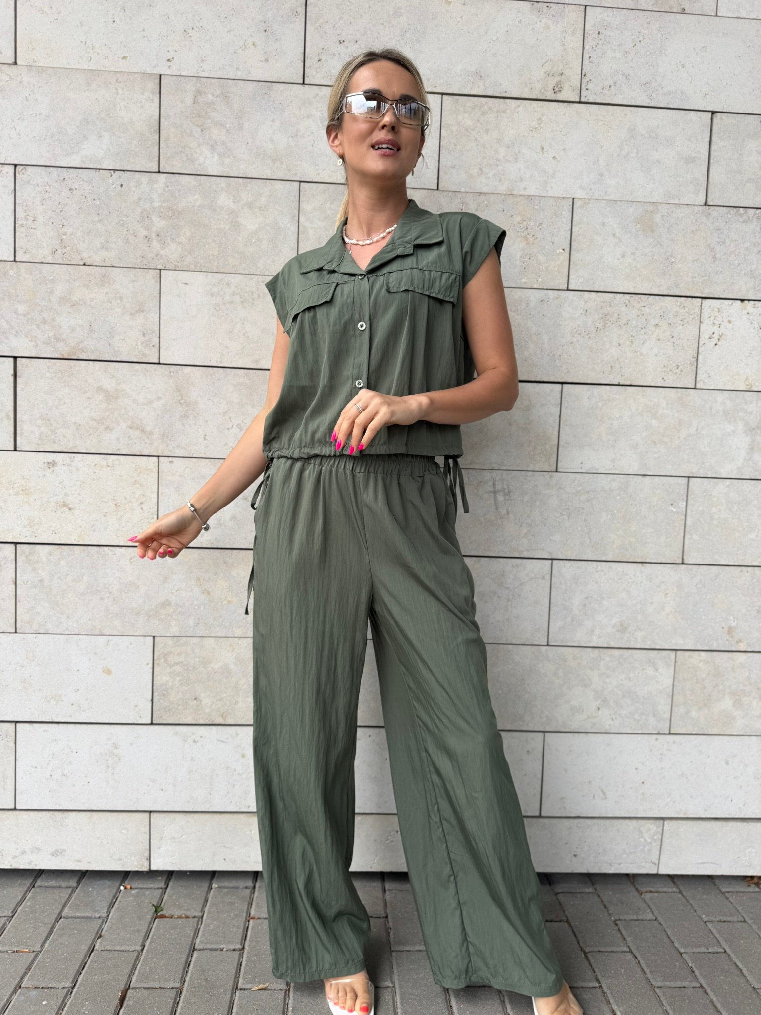 Laisvė, kuri juda kartu su Tavimi. Šis lengvas, krintantis „Easy Elegance“ dviejų dalių komplektas – tai miesto vasaros klasika. Oversize tipo viršus su kišenėlėmis suteikia šiuolaikiško stiliaus pojūtį, o plačios kelnės nevaržo judesių ir leidžia jaustis patogiai visą dieną.