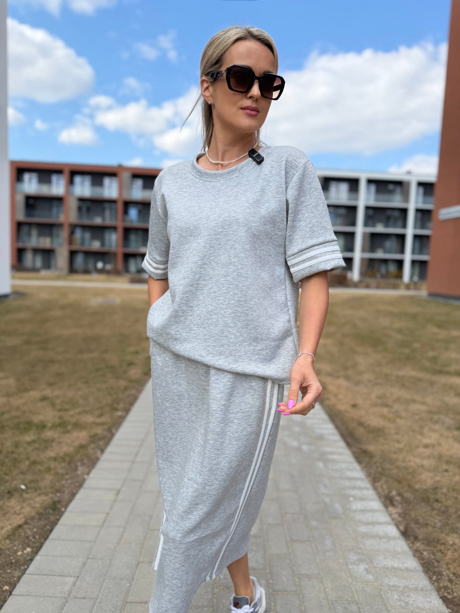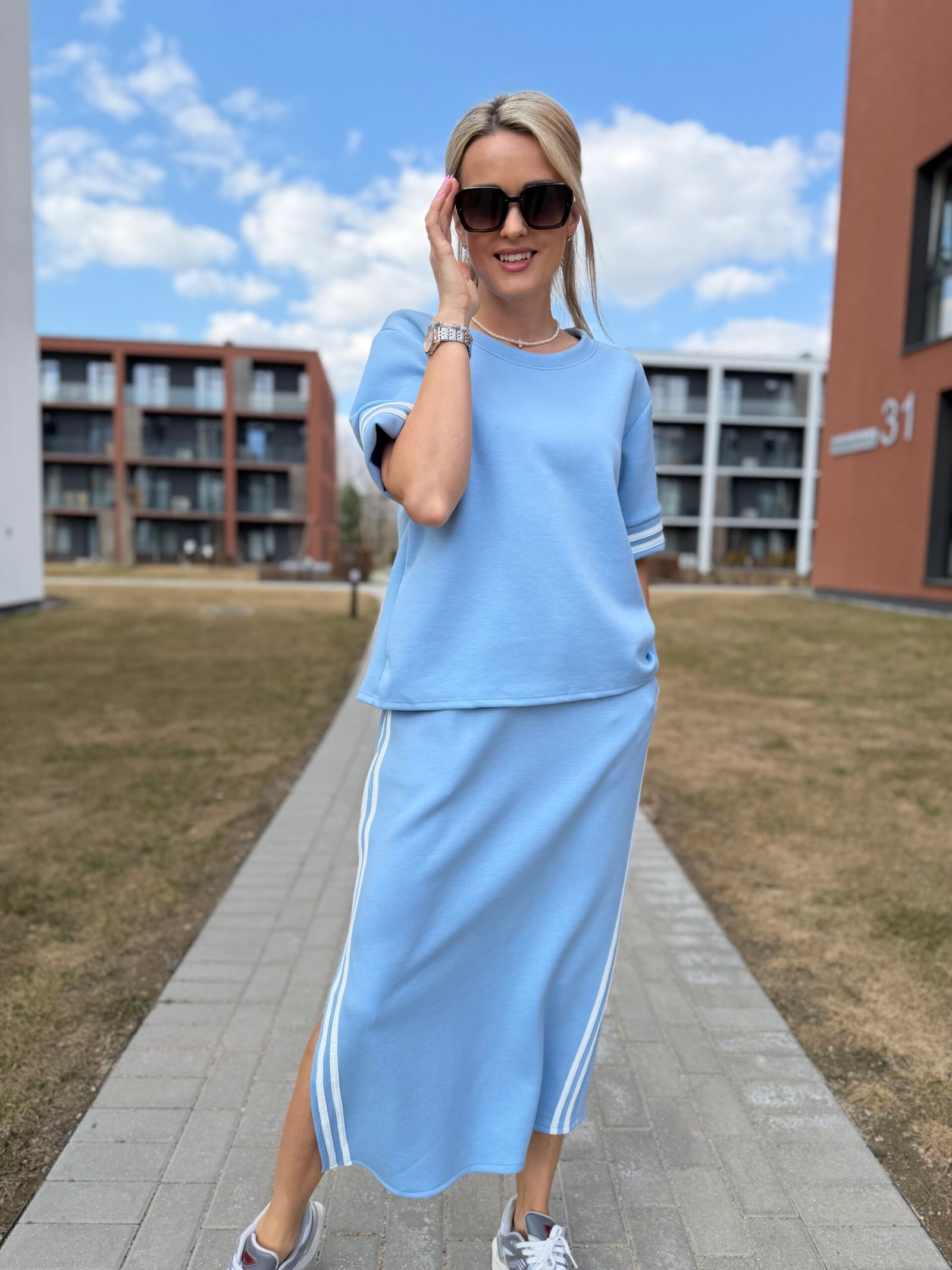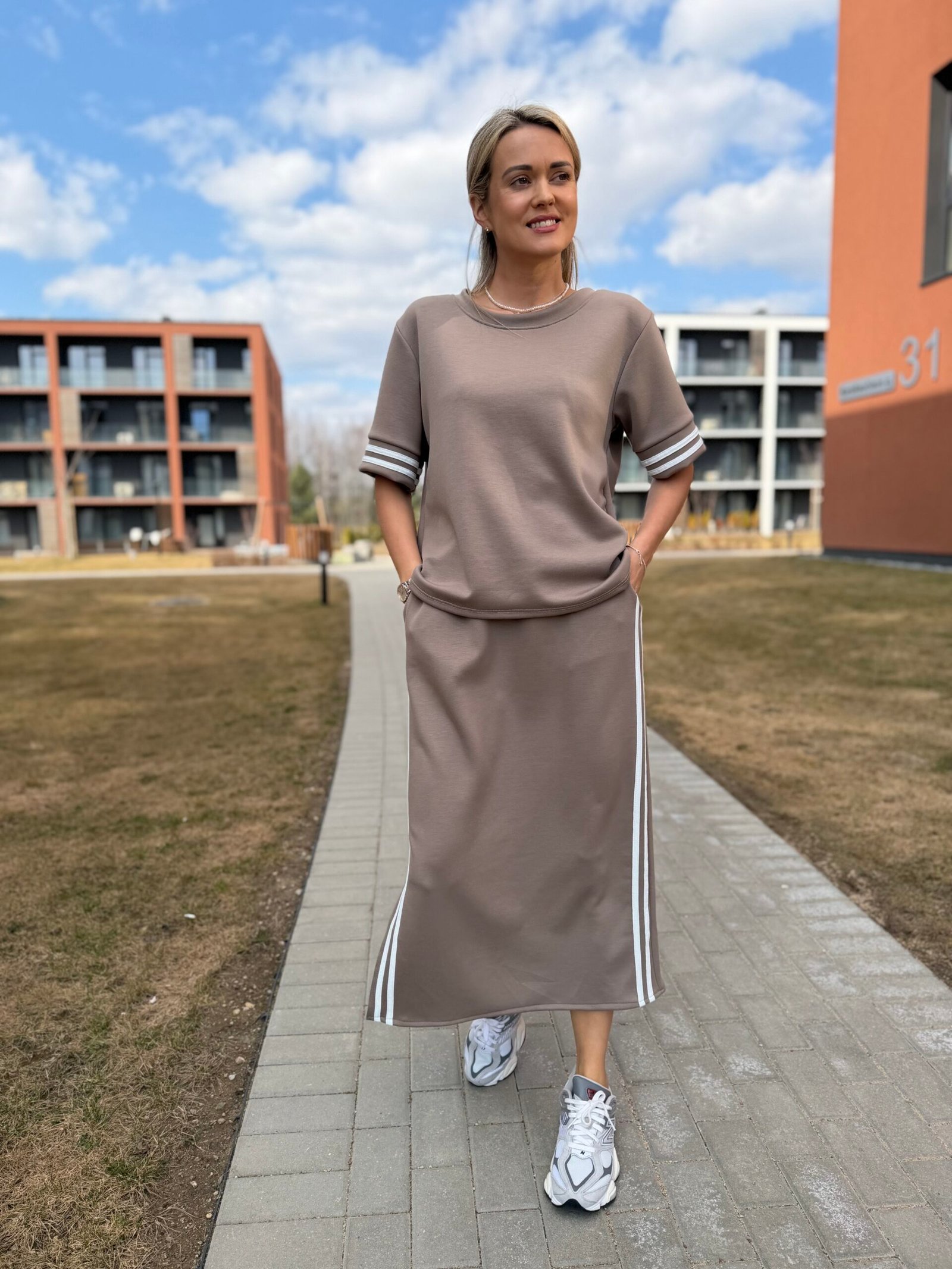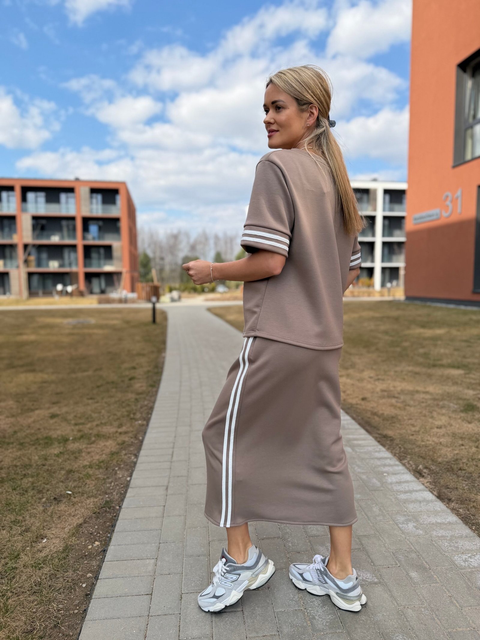 Viršutinė dalis – laisvesnio silueto džemperis, kuris gražiai krenta ir suteikia lengvą „oversize“ efektą. Sijonas – midi ilgio, su skeltuku ir sportiškomis juostelėmis šonuose, kurios vizualiai ilgina siluetą ir suteikia dinamiškumo.