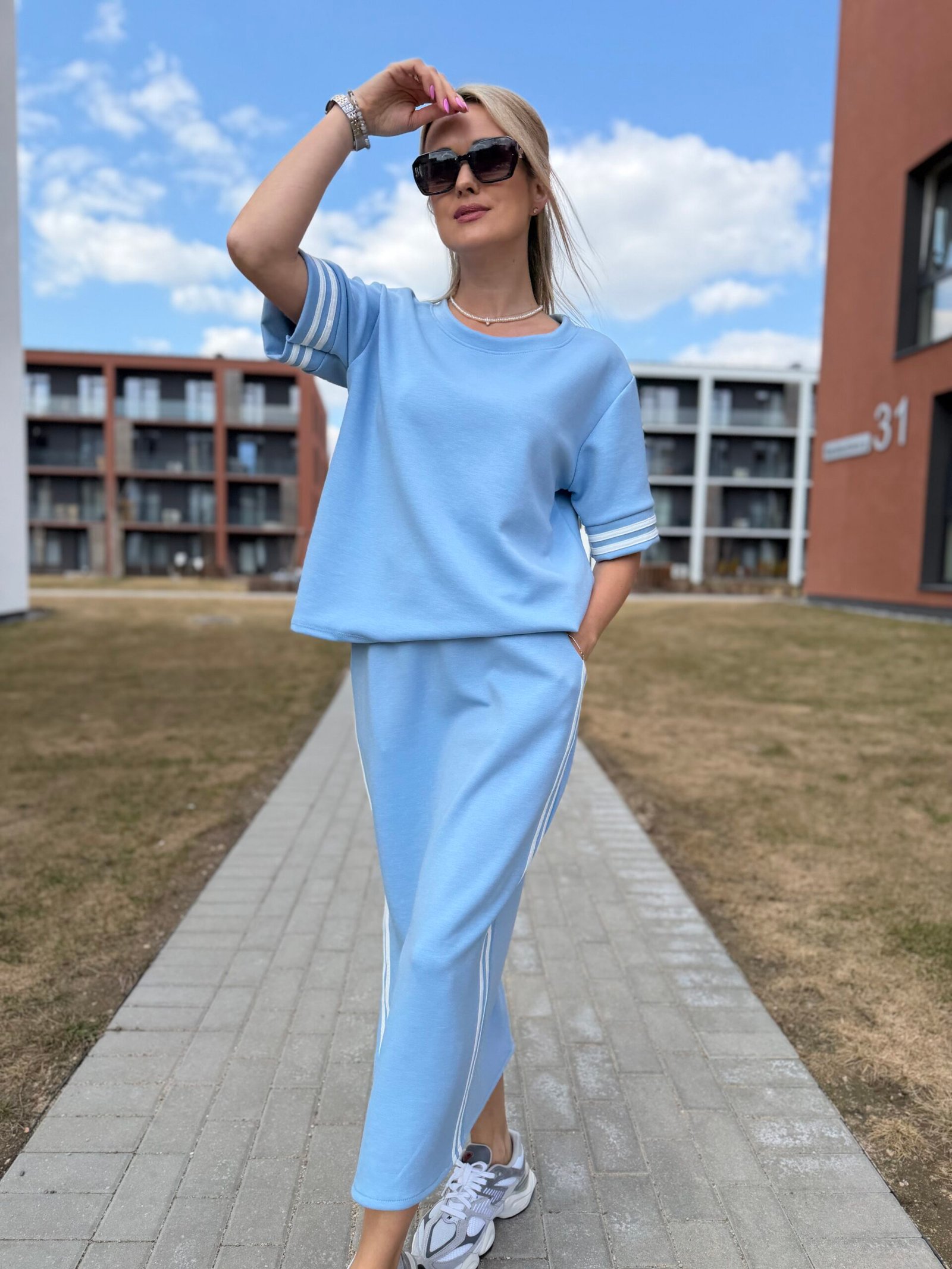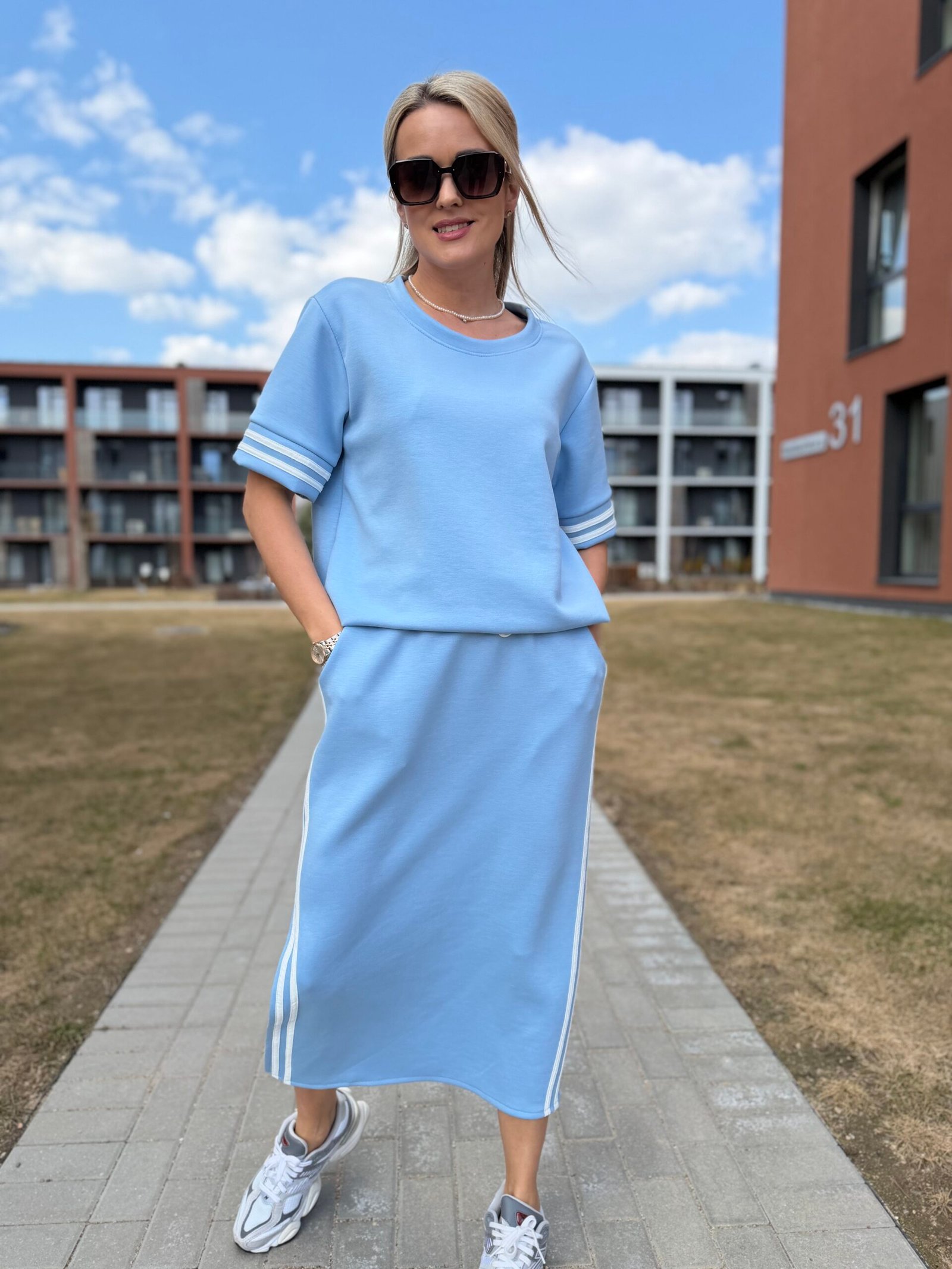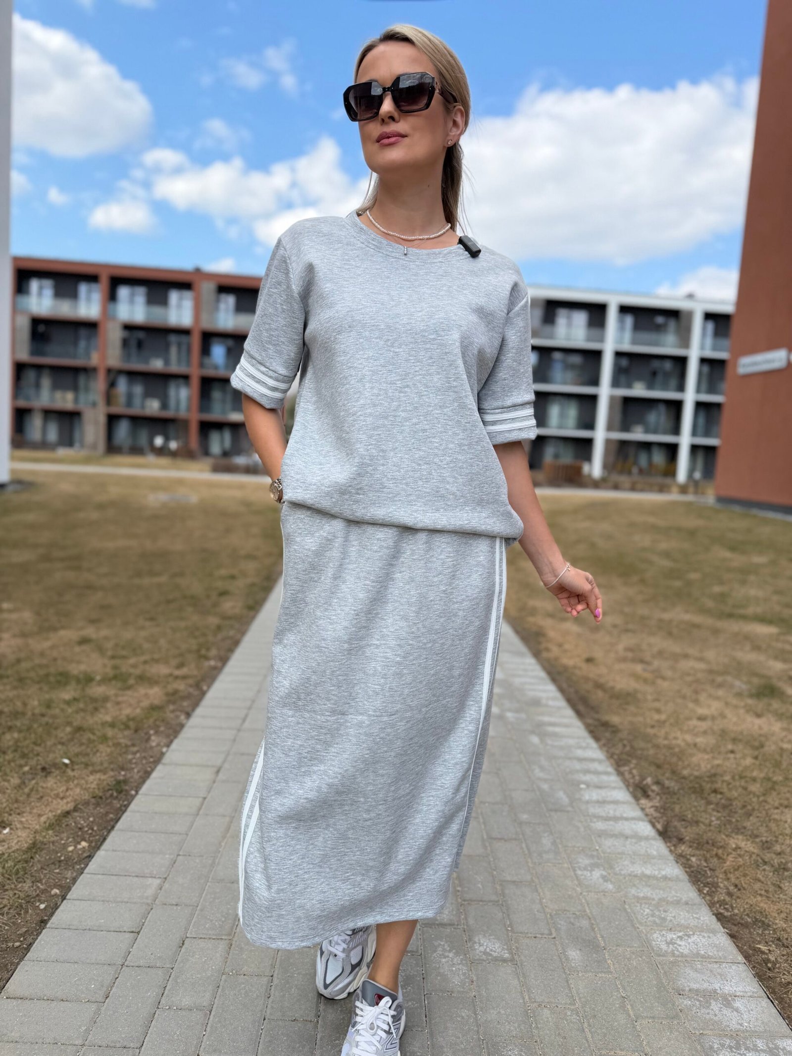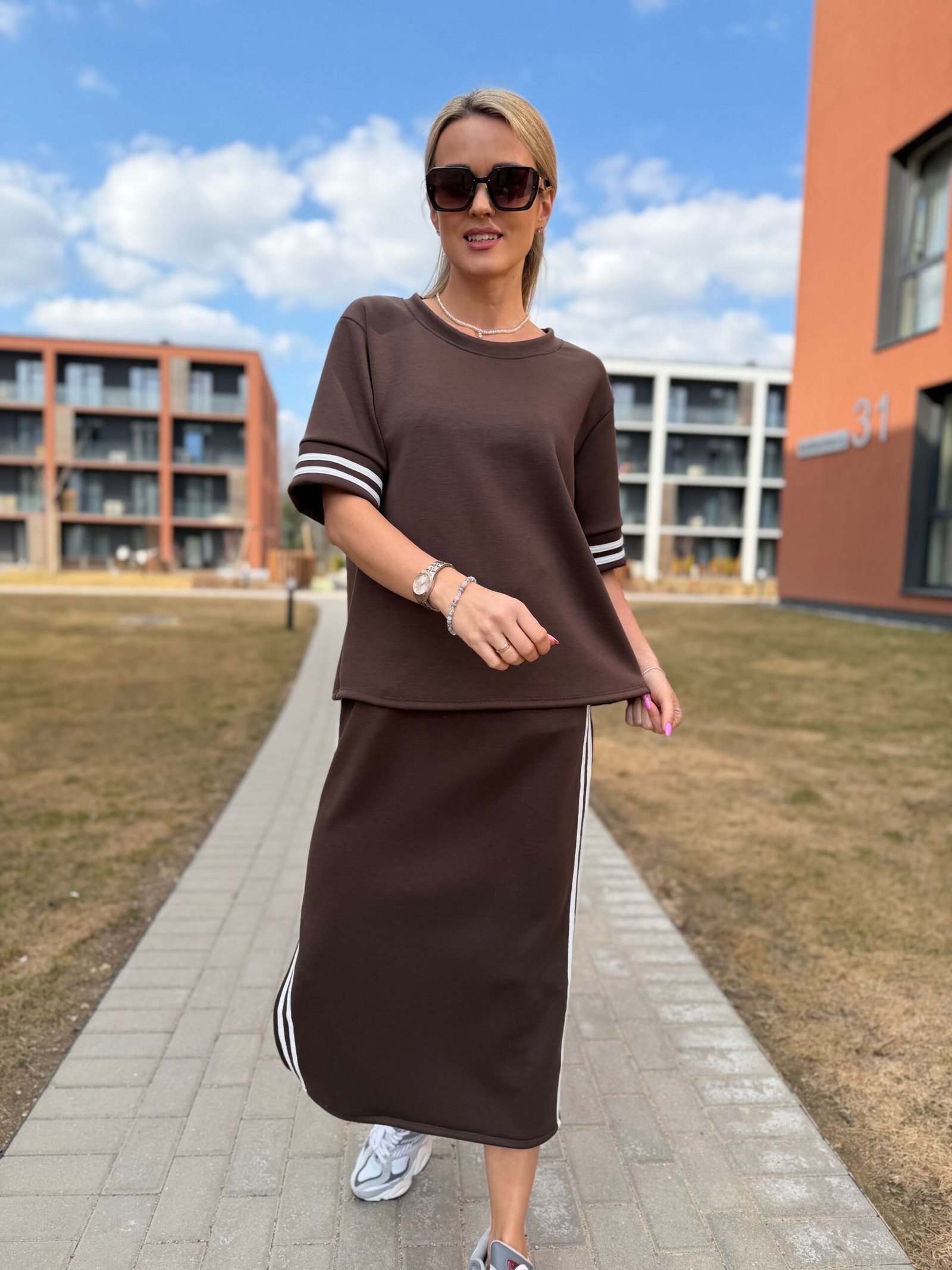 Viršutinė dalis – laisvesnio silueto džemperis, kuris gražiai krenta ir suteikia lengvą „oversize“ efektą. Sijonas – midi ilgio, su skeltuku ir sportiškomis juostelėmis šonuose, kurios vizualiai ilgina siluetą ir suteikia dinamiškumo.