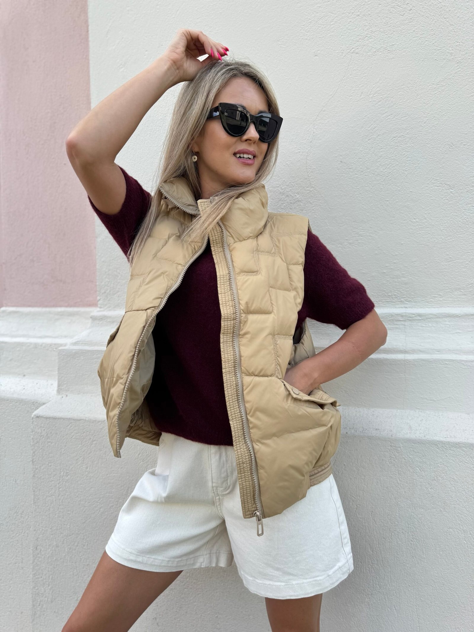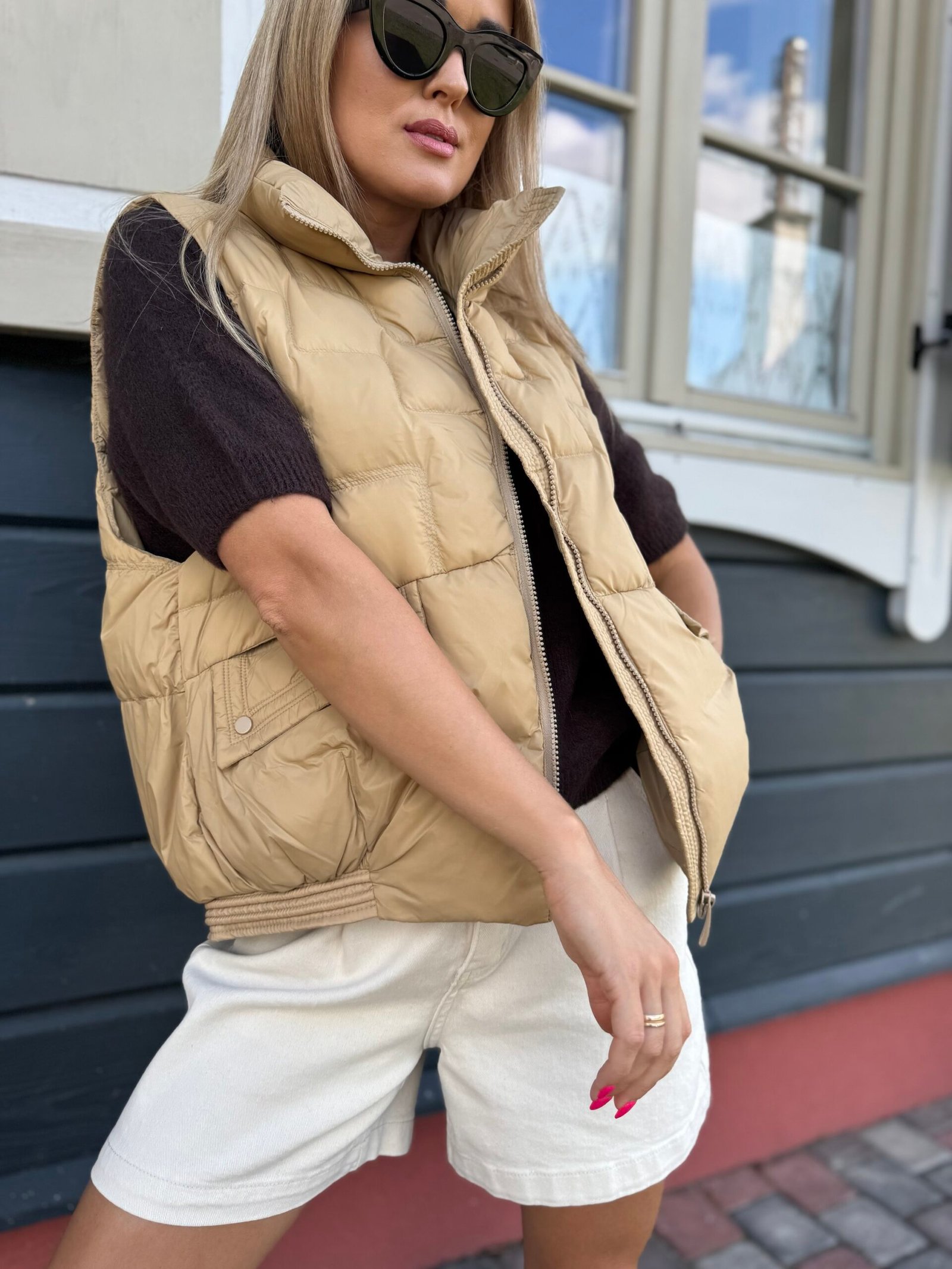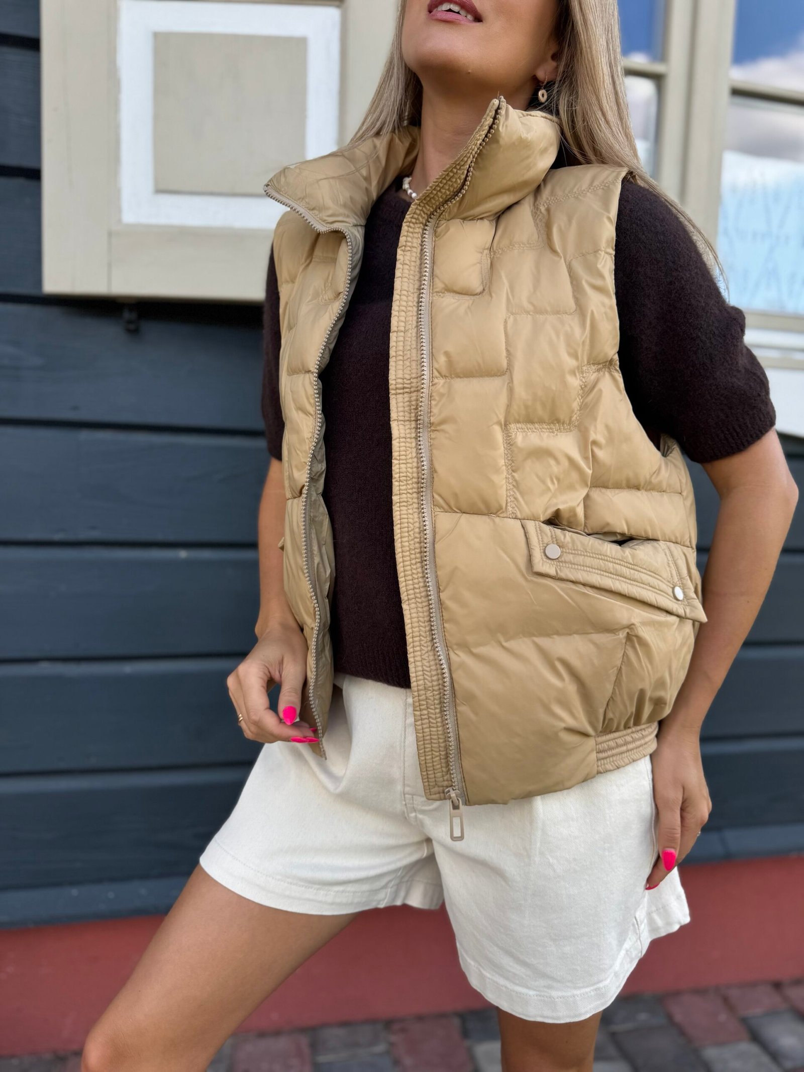 „Уличное жаркое“ Жилет - это тепло без веса и стиль без усилий. Эластичный пояс тонко формирует силуэт, а пуховый наполнитель незаметно согревает вас.