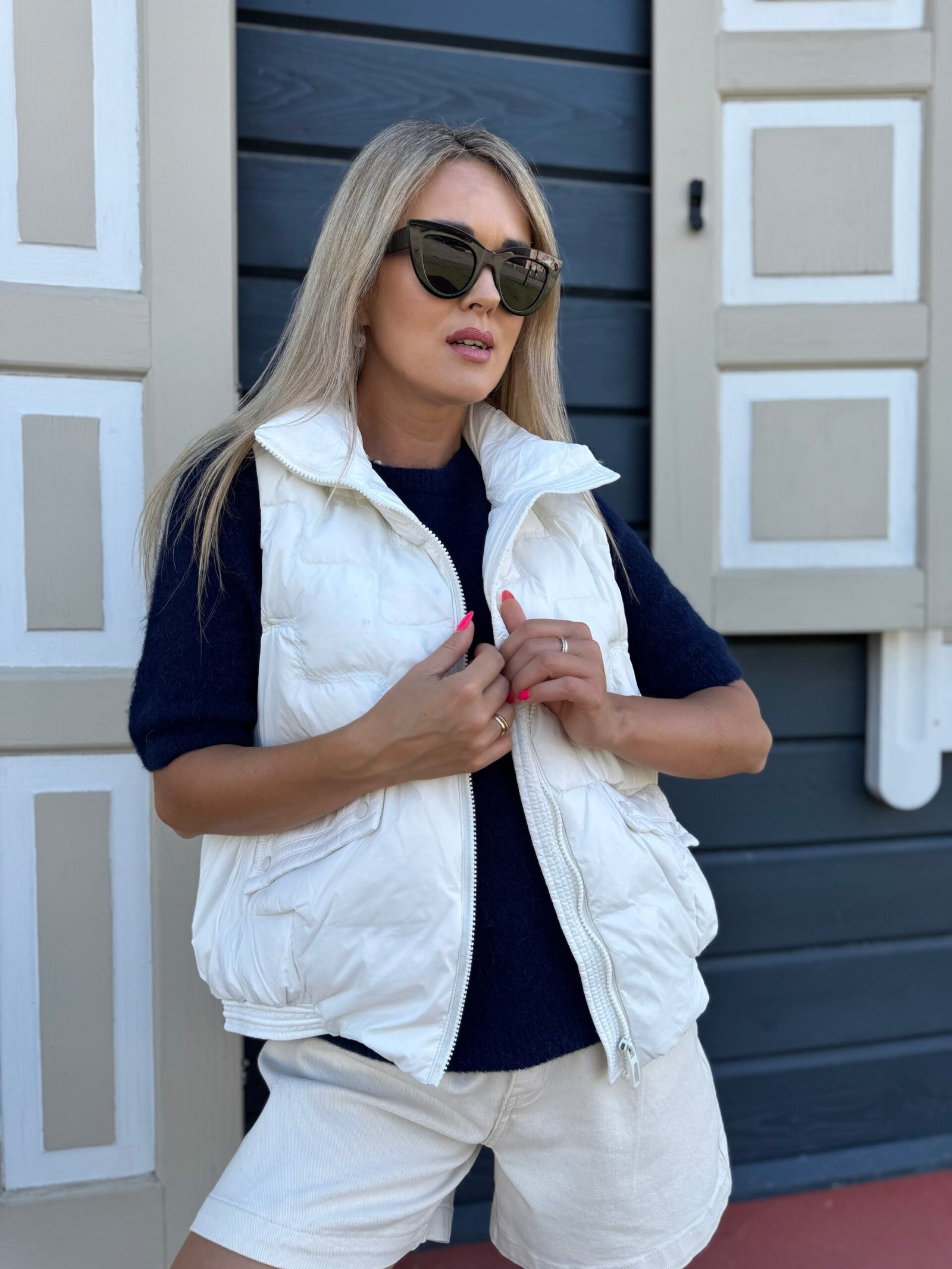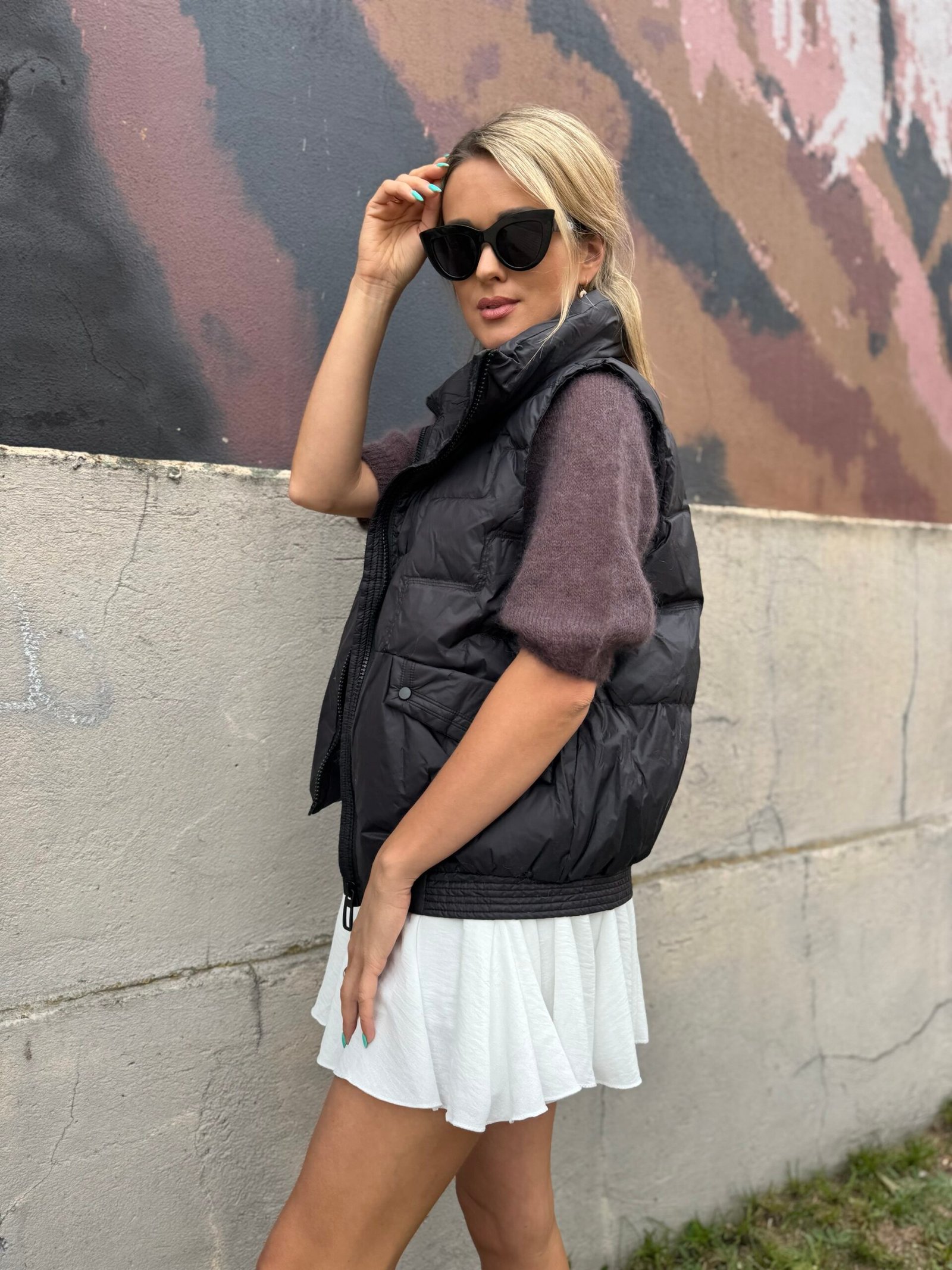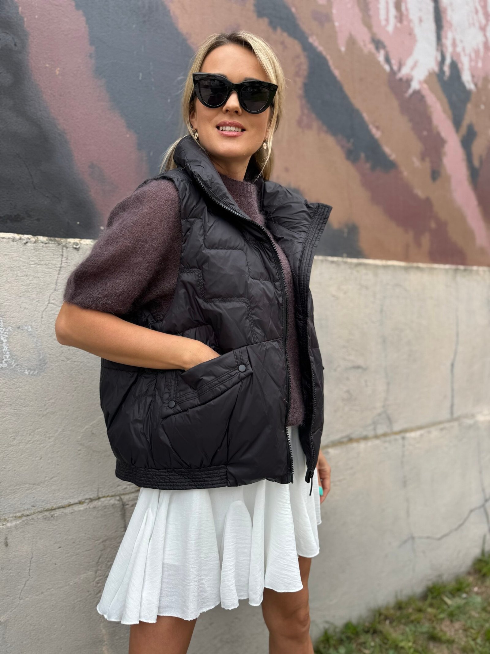 „Уличное жаркое“ Жилет - это тепло без веса и стиль без усилий. Эластичный пояс тонко формирует силуэт, а пуховый наполнитель незаметно согревает вас.