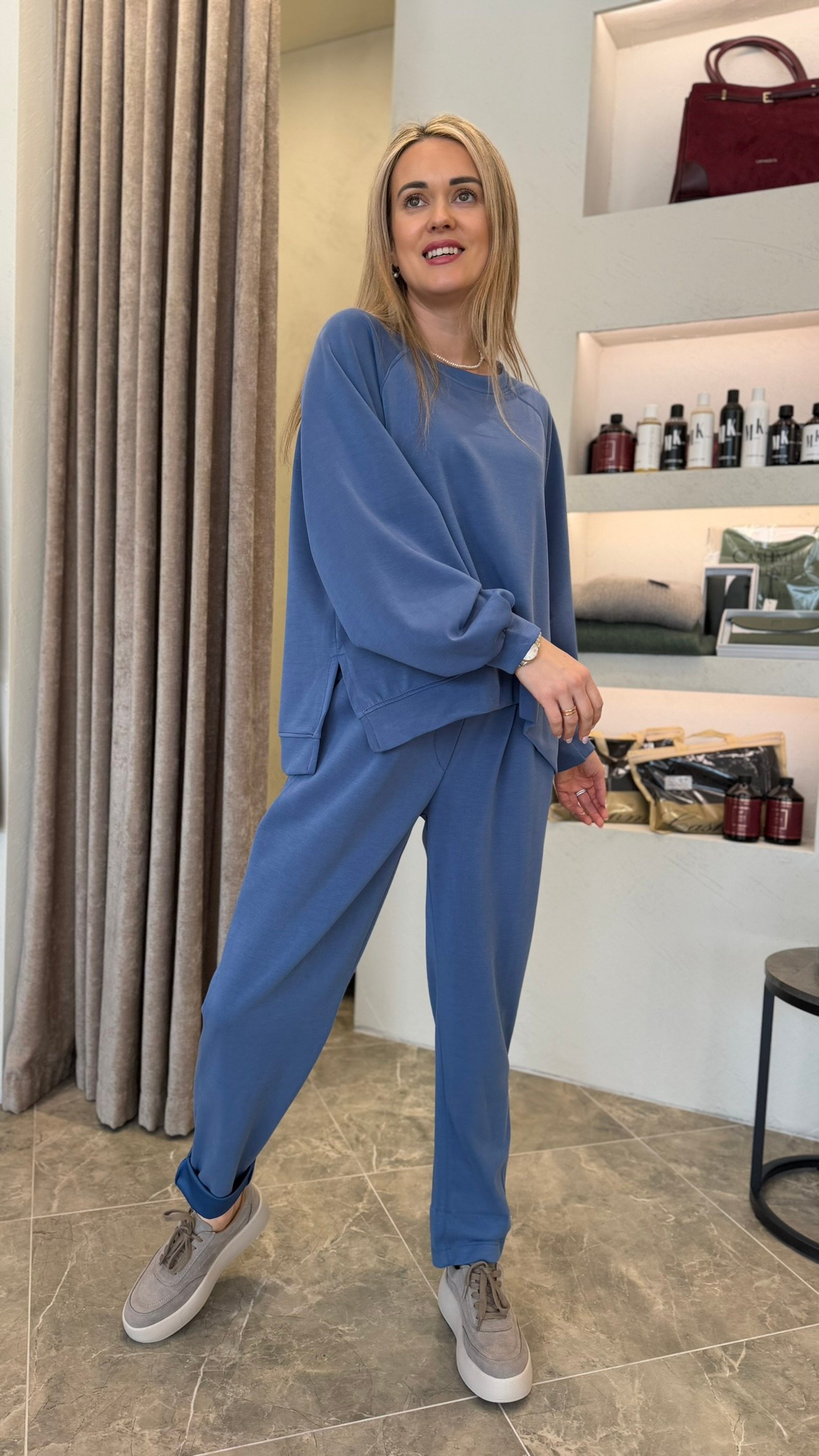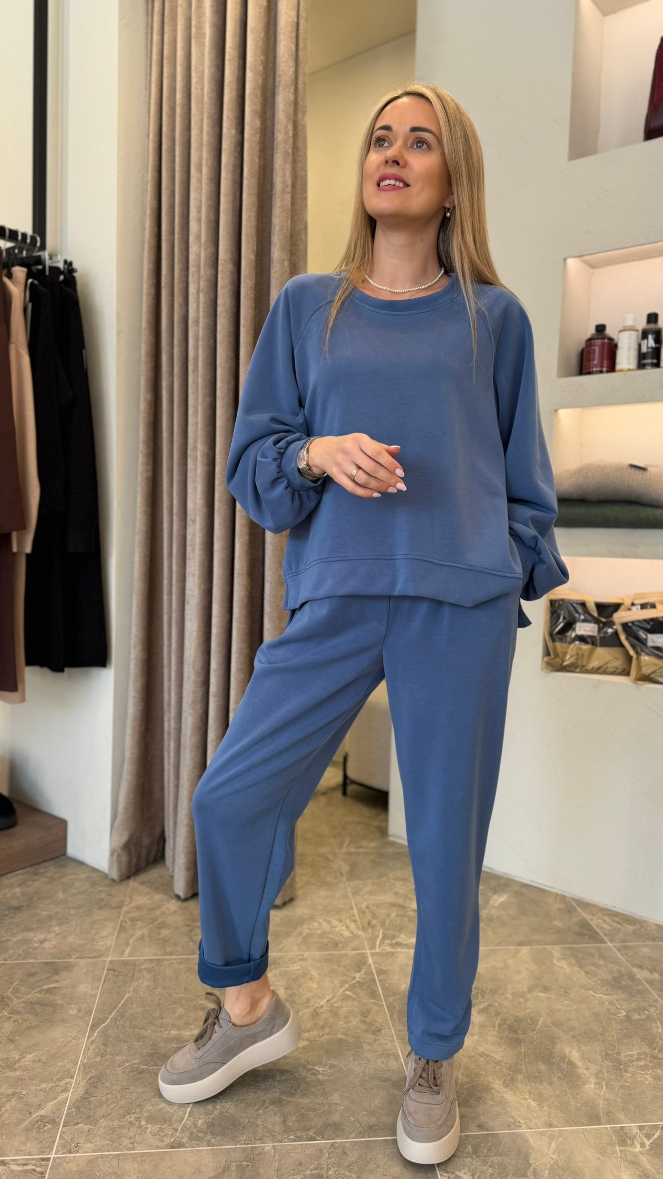 Laisvas siluetas, švelniai krentantis bliuzonas ir patogios kelnės su guma leidžia judėti laisvai ir jaustis užtikrintai. Puikiai tinka tiek namams, tiek pasivaikščiojimams ar kelionėms.