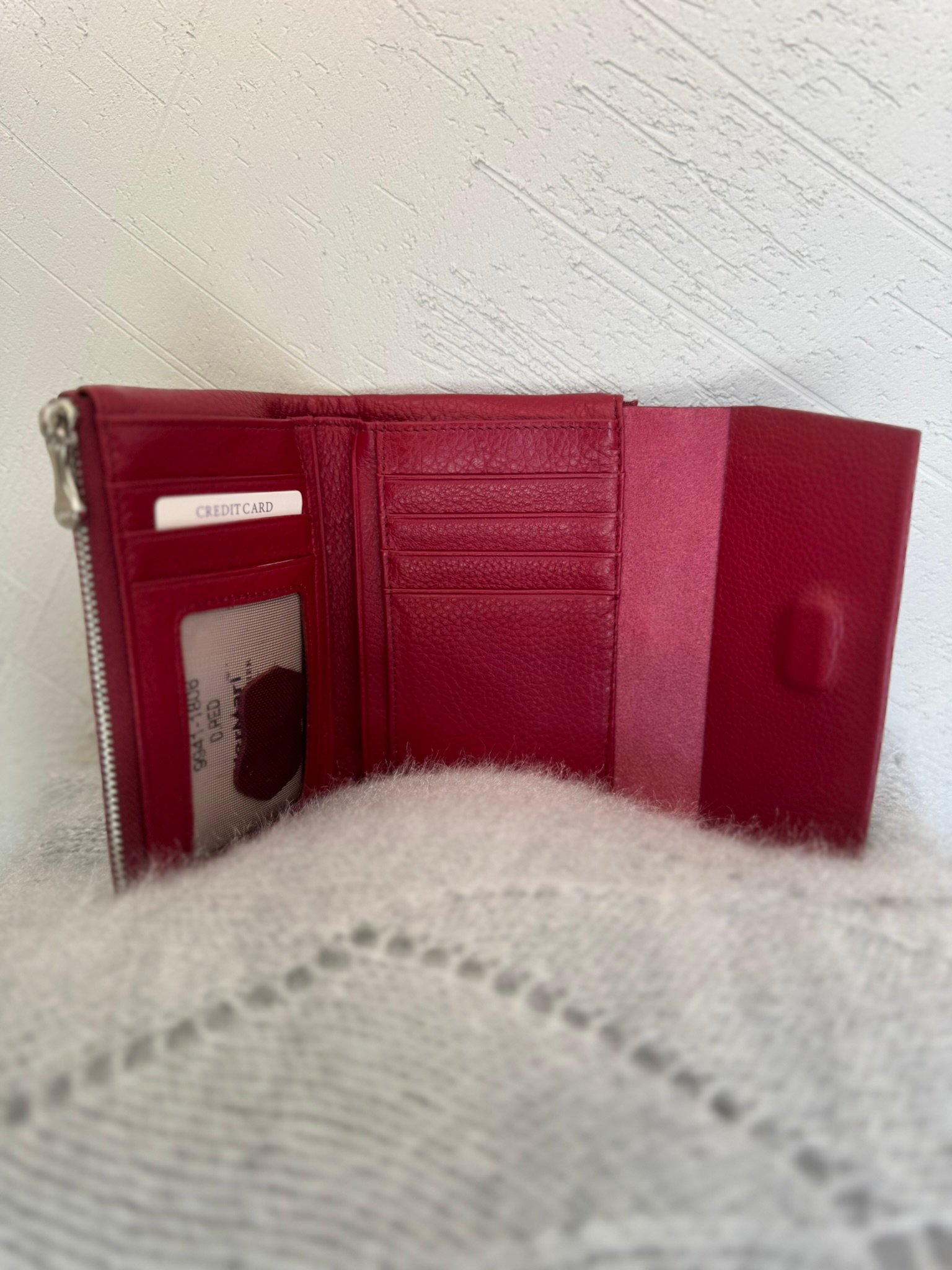 Stilinga moteriška piniginė, išsiskirianti klasikinėmis spalvomis – juoda, pelenų rožės ir ryškiai raudona.