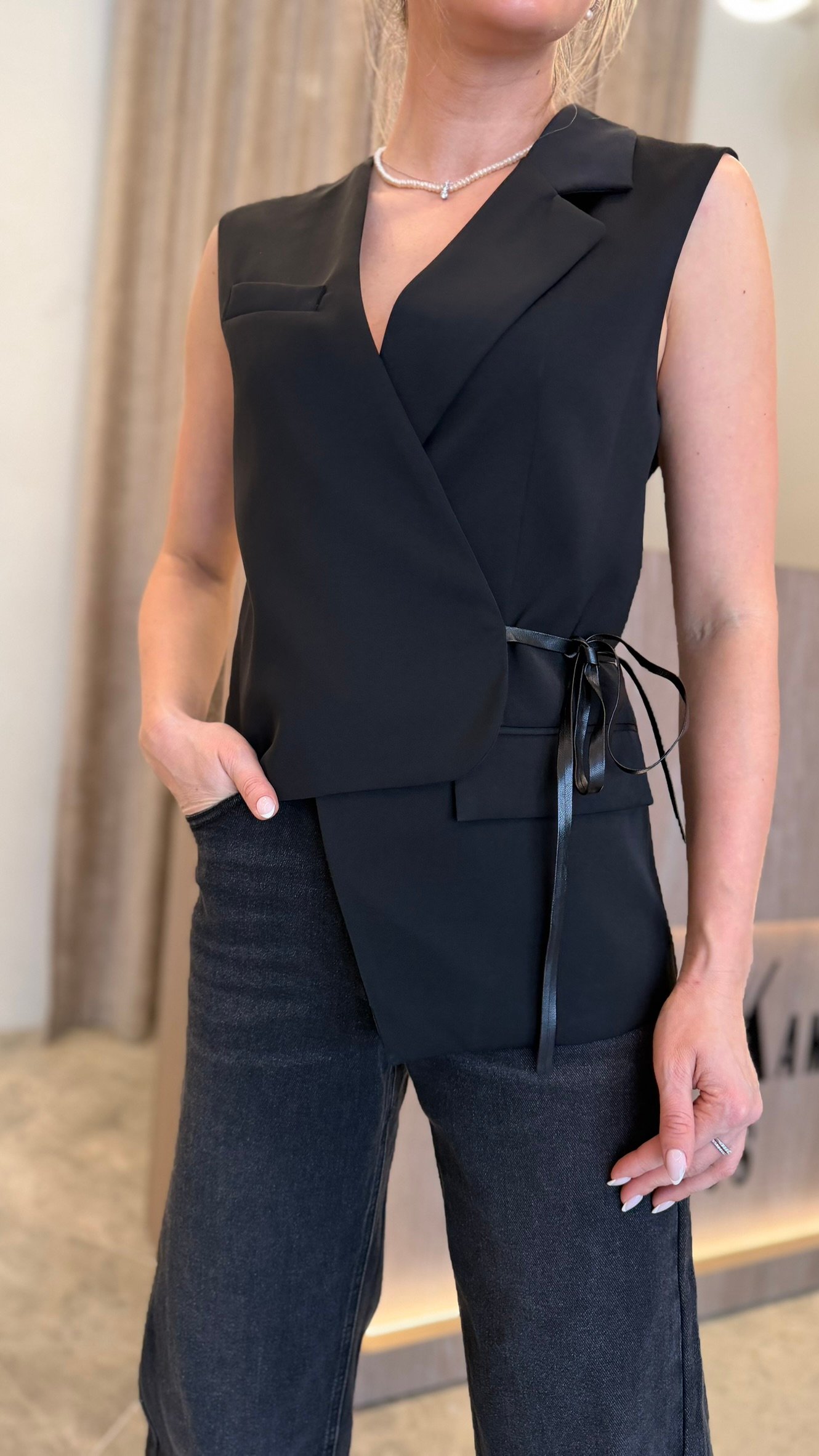 Stilinga, asimetriško kirpimo liemenė, kuri subtiliai pabrėžia siluetą ir suteikia įvaizdžiui modernios elegancijos. Modelis išsiskiria dekoratyviniais šoniniais raišteliais, leidžiančiais reguliuoti liemenės plotį pagal figūrą – patogu ir labai estetiška.