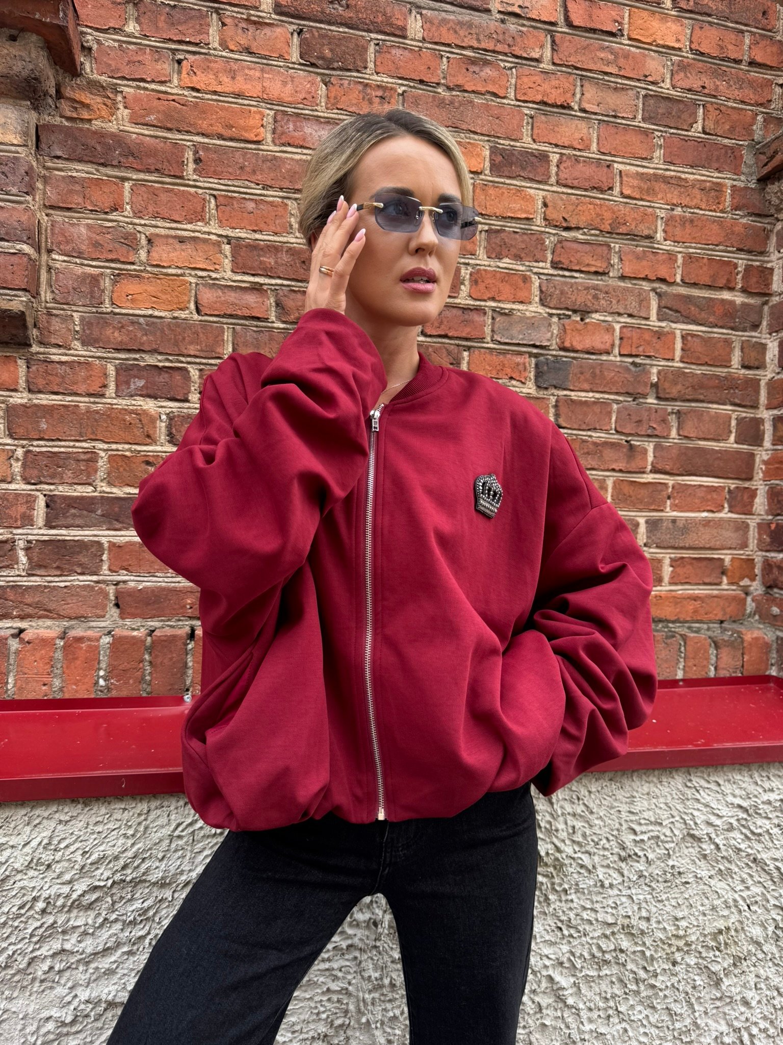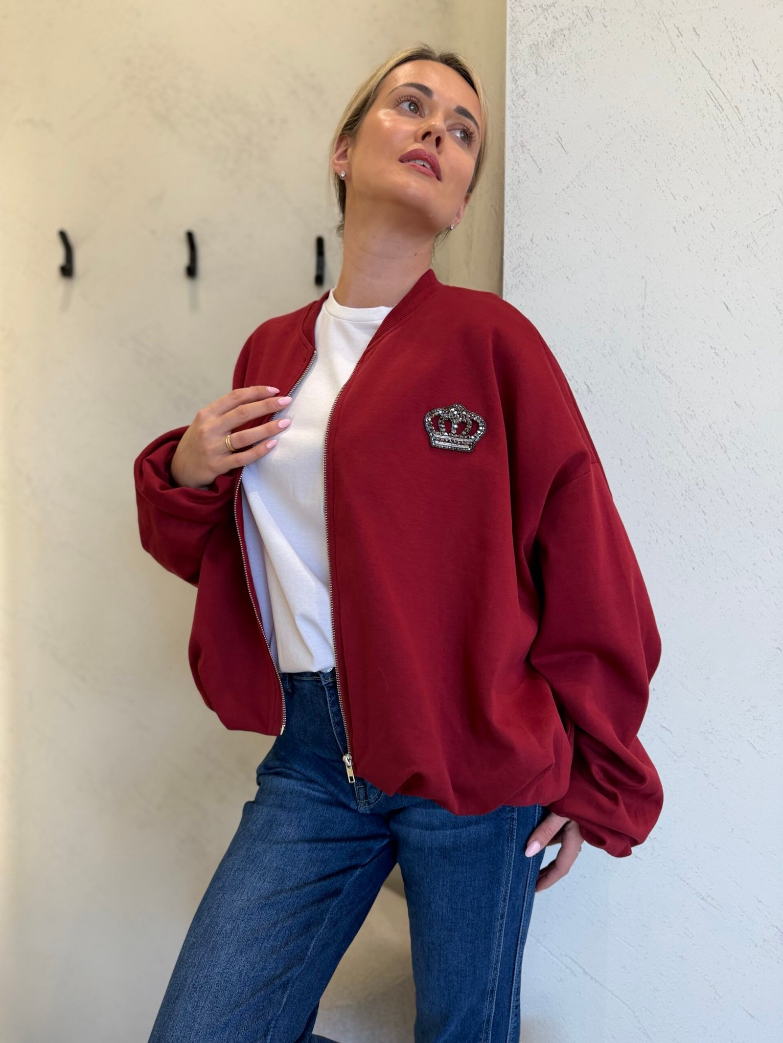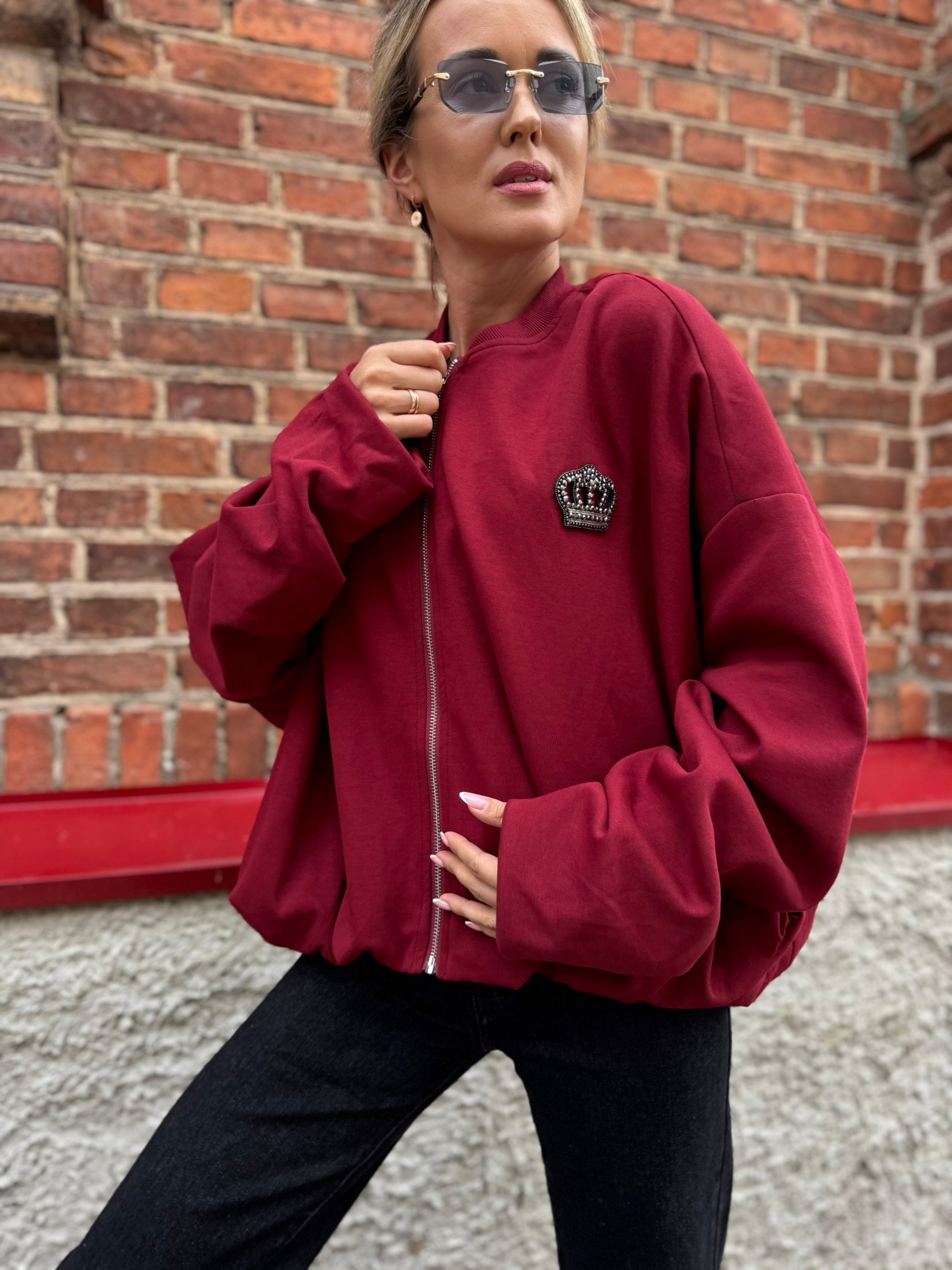 „Royal Chic“ – stilingas bordo spalvos švarkelis, kuris išsiskiria oversize siluetu ir dekoratyvine karūnos aplikacija. Lengvai krentantis, platesnių rankovių modelis su užtrauktuku sujungia komfortą ir eleganciją, todėl puikiai tinka tiek kasdienai, tiek ypatingoms progoms.