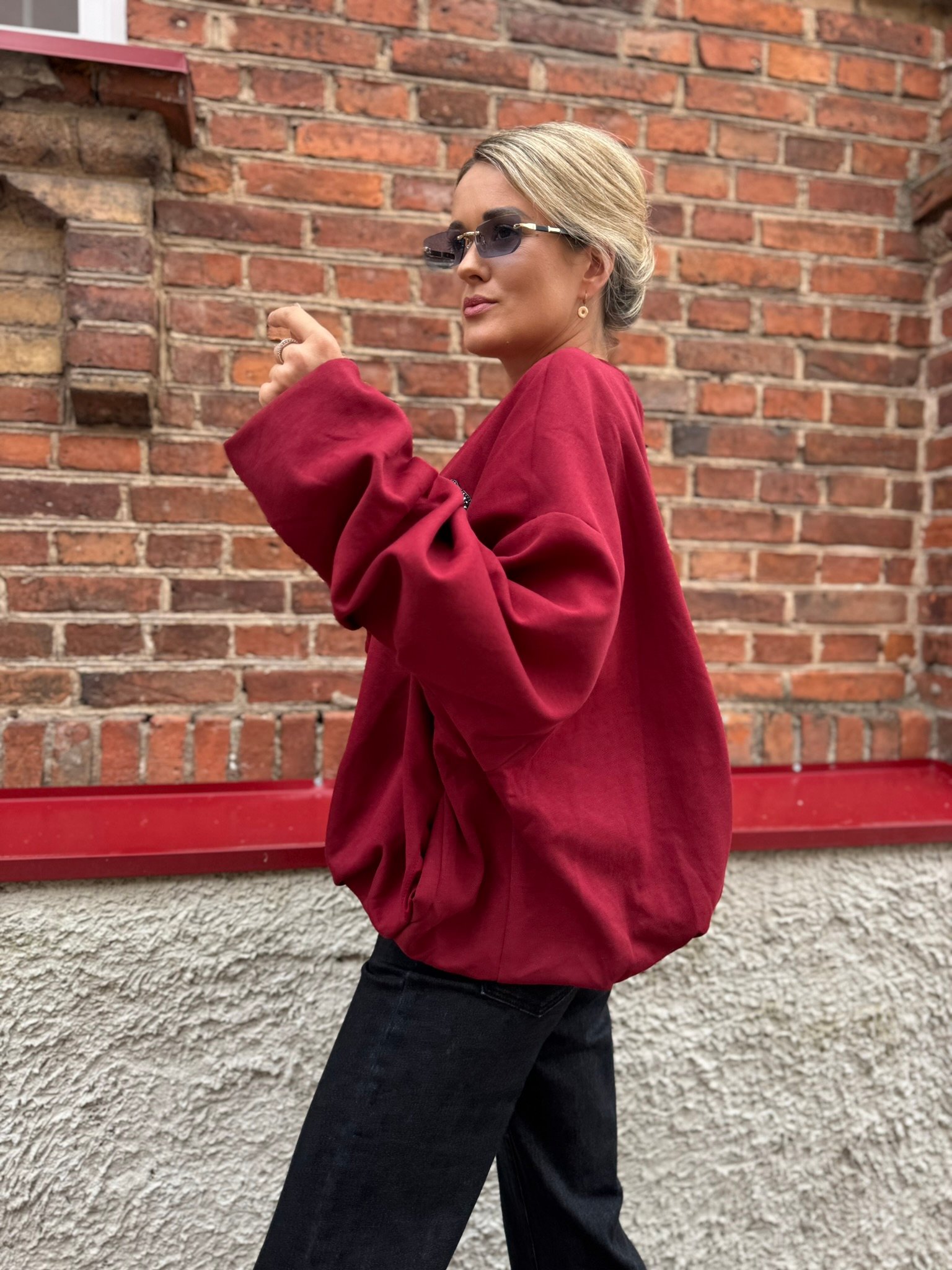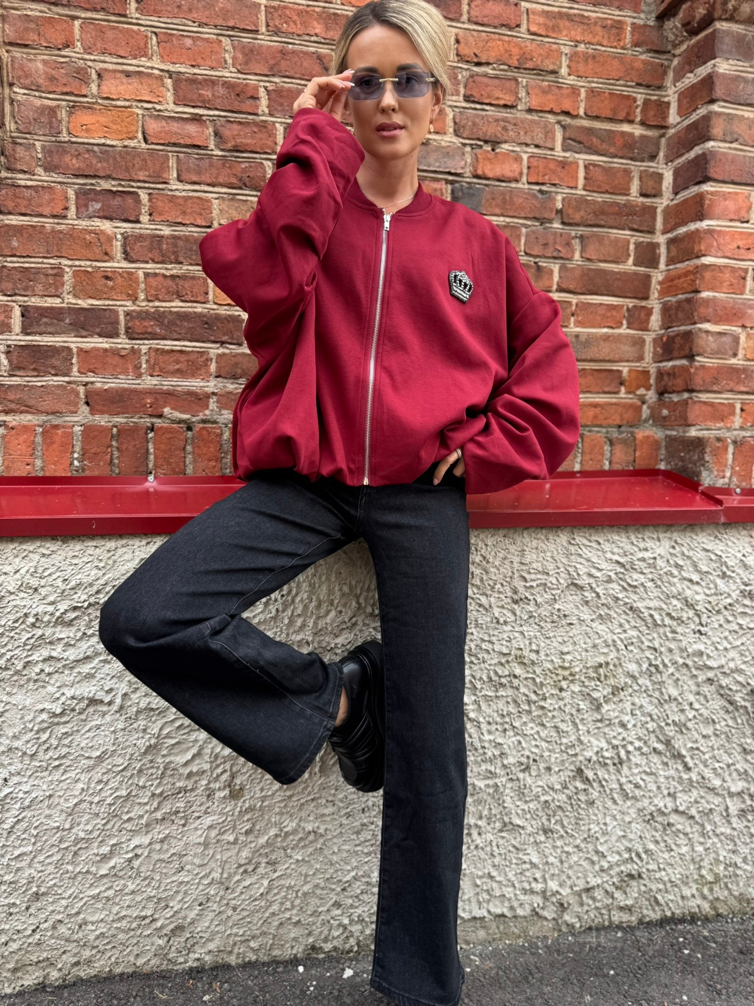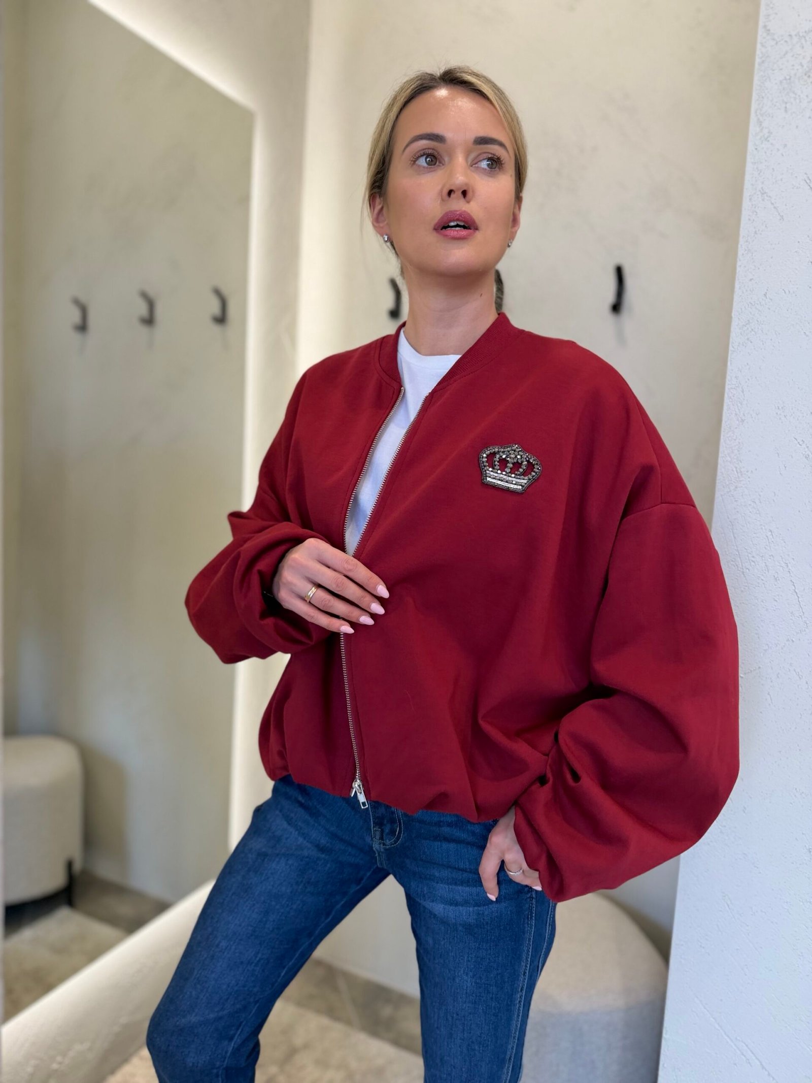 „Royal Chic“ – stilingas bordo spalvos švarkelis, kuris išsiskiria oversize siluetu ir dekoratyvine karūnos aplikacija. Lengvai krentantis, platesnių rankovių modelis su užtrauktuku sujungia komfortą ir eleganciją, todėl puikiai tinka tiek kasdienai, tiek ypatingoms progoms.
