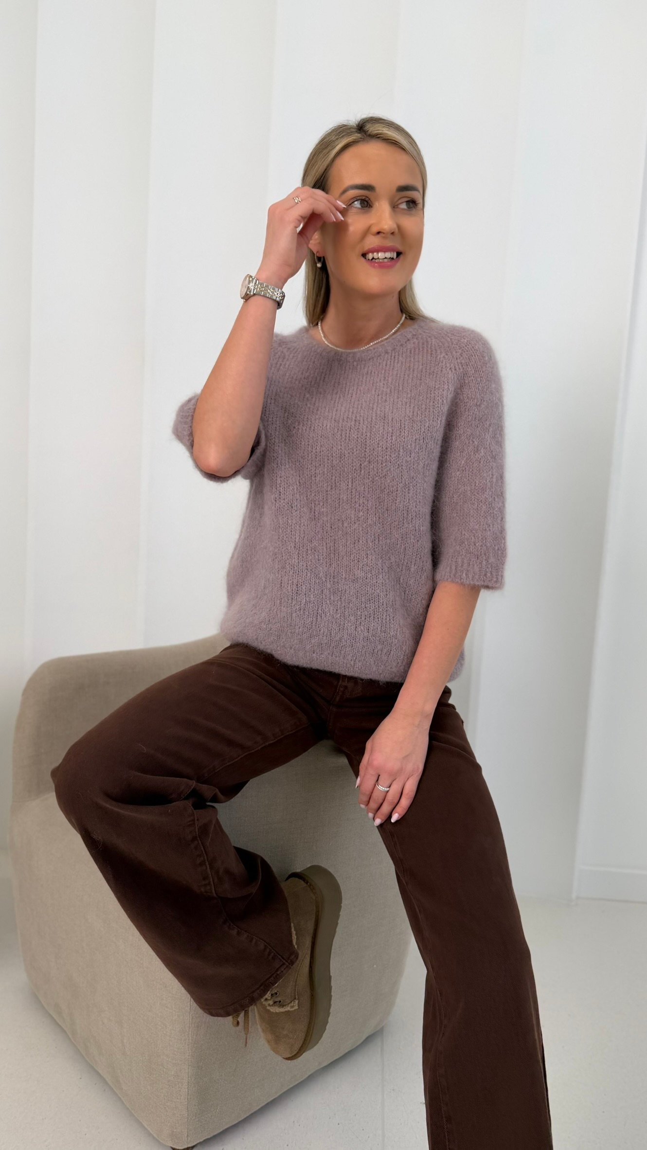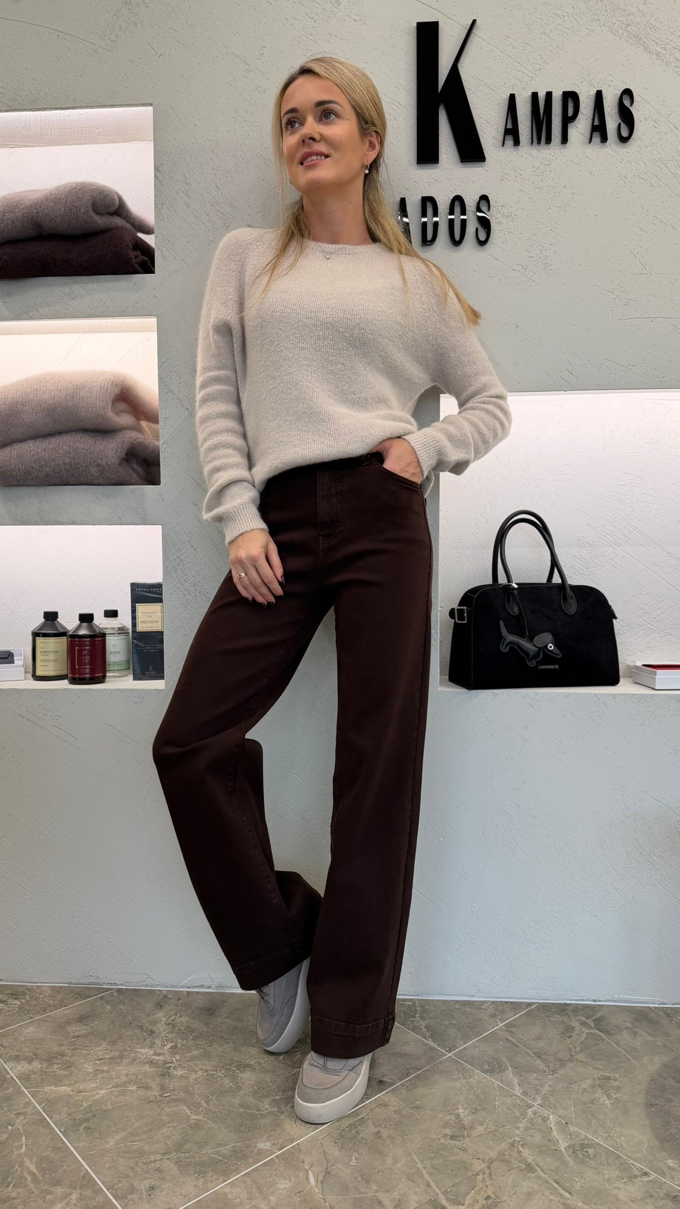 Sodri šokolado spalva suteikia šilumos ir lengvai derinasi prie neutralių tonų megztinių ar paltukų.